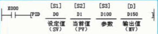 D0为设定值即为我们给定的值,D1为当前值,D100为PID在运算中所需要的一些参数,这里共有25个数据从:D100~D124,D150表示的为输出值。