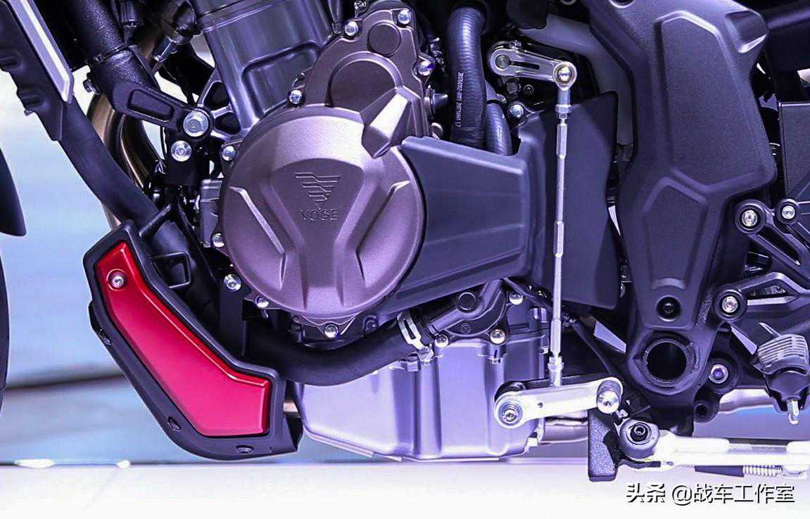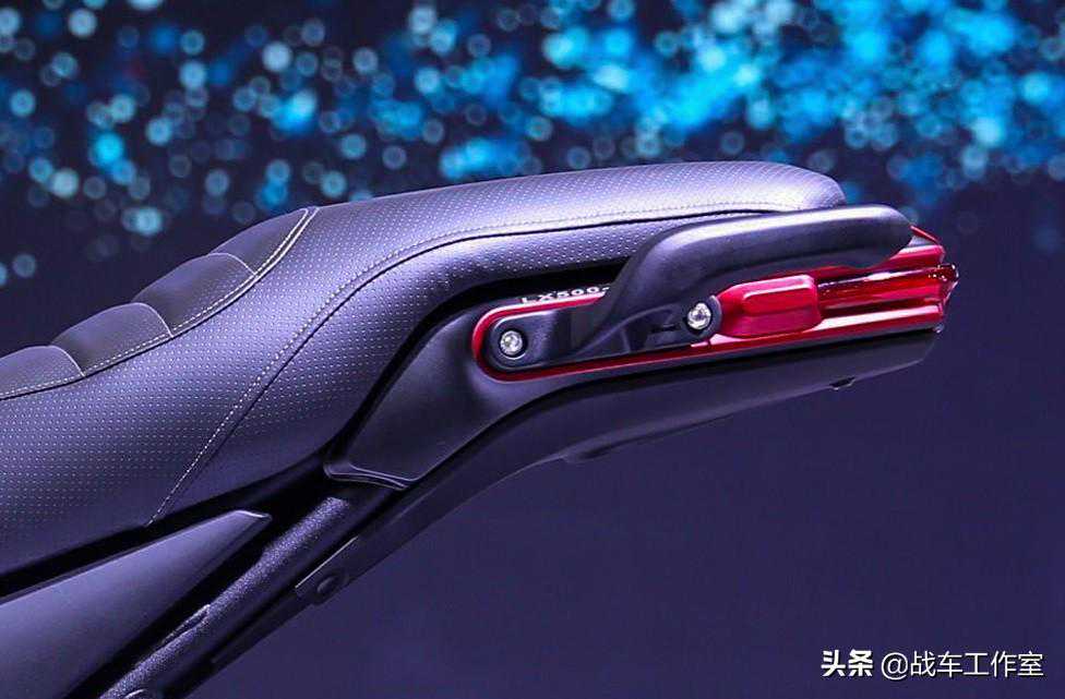 油箱下方靠前的装饰壳,算是AC500设计亮点。可以很好的遮挡车架加强筋的留白,还能遮挡好几个焊接点。这样,从侧面看整车时候,这块壳子很好的补足了油箱前方倾斜下坠的线条。让车头的动线下降,也让车头变得饱满。