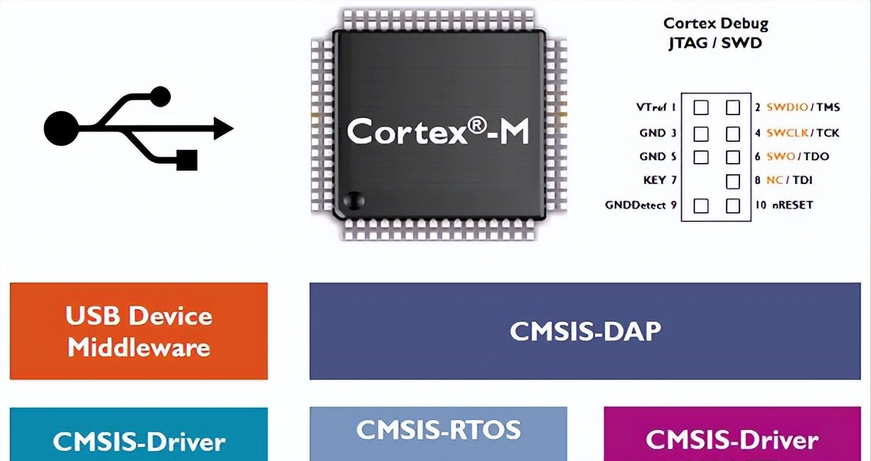 CMSIS-DAP为调试器提供标准化的接口,支持5线JTAG或2线SWD,其固件作为源代码提供。