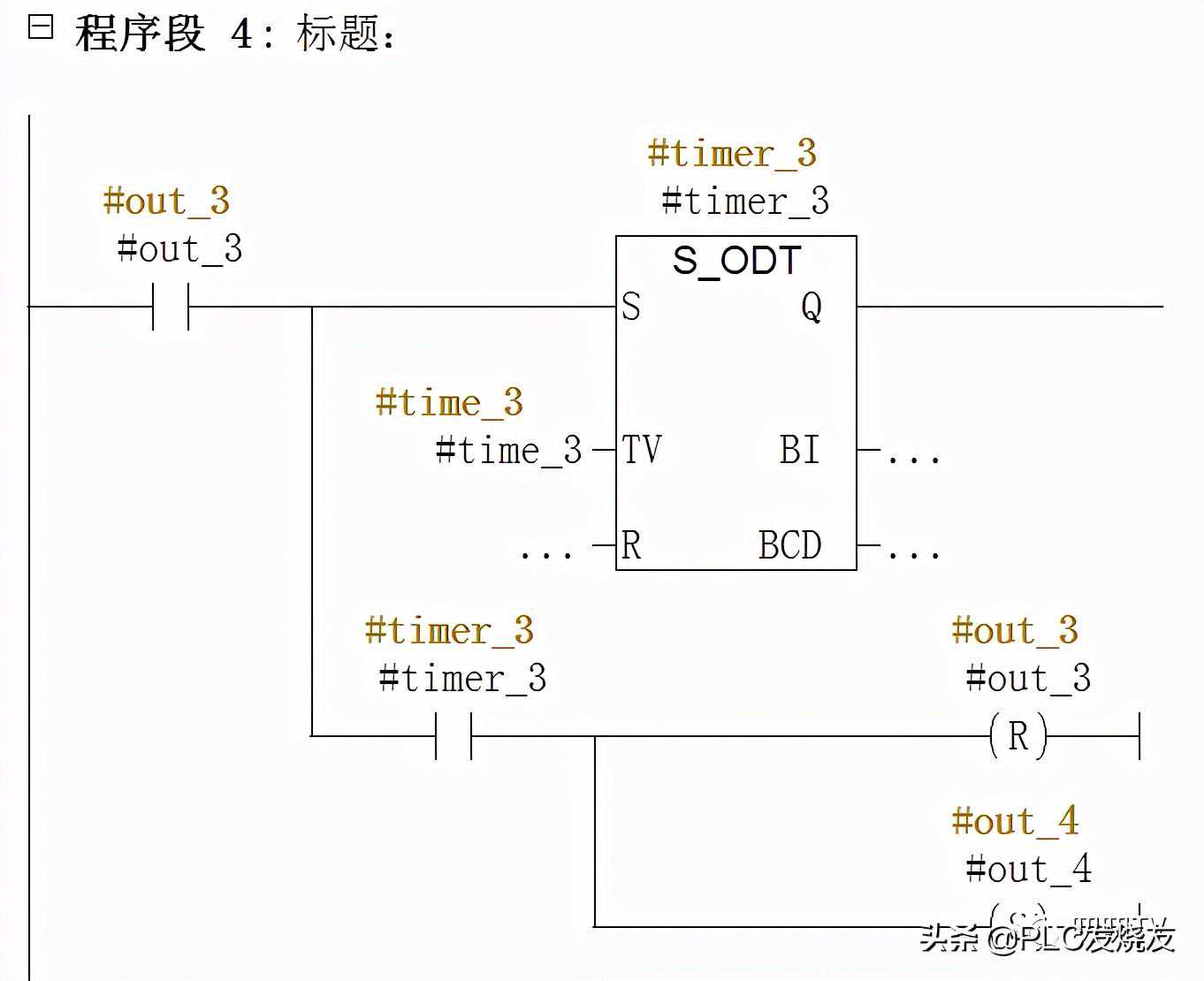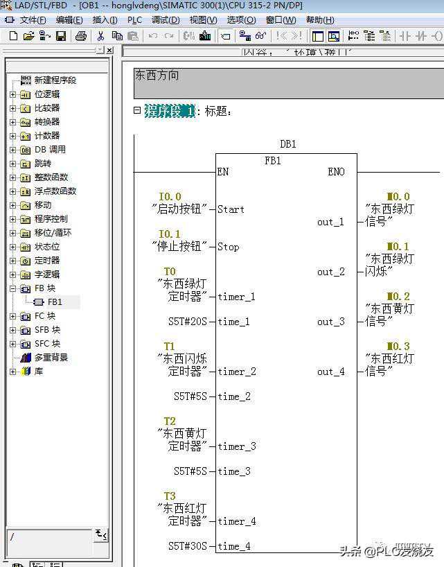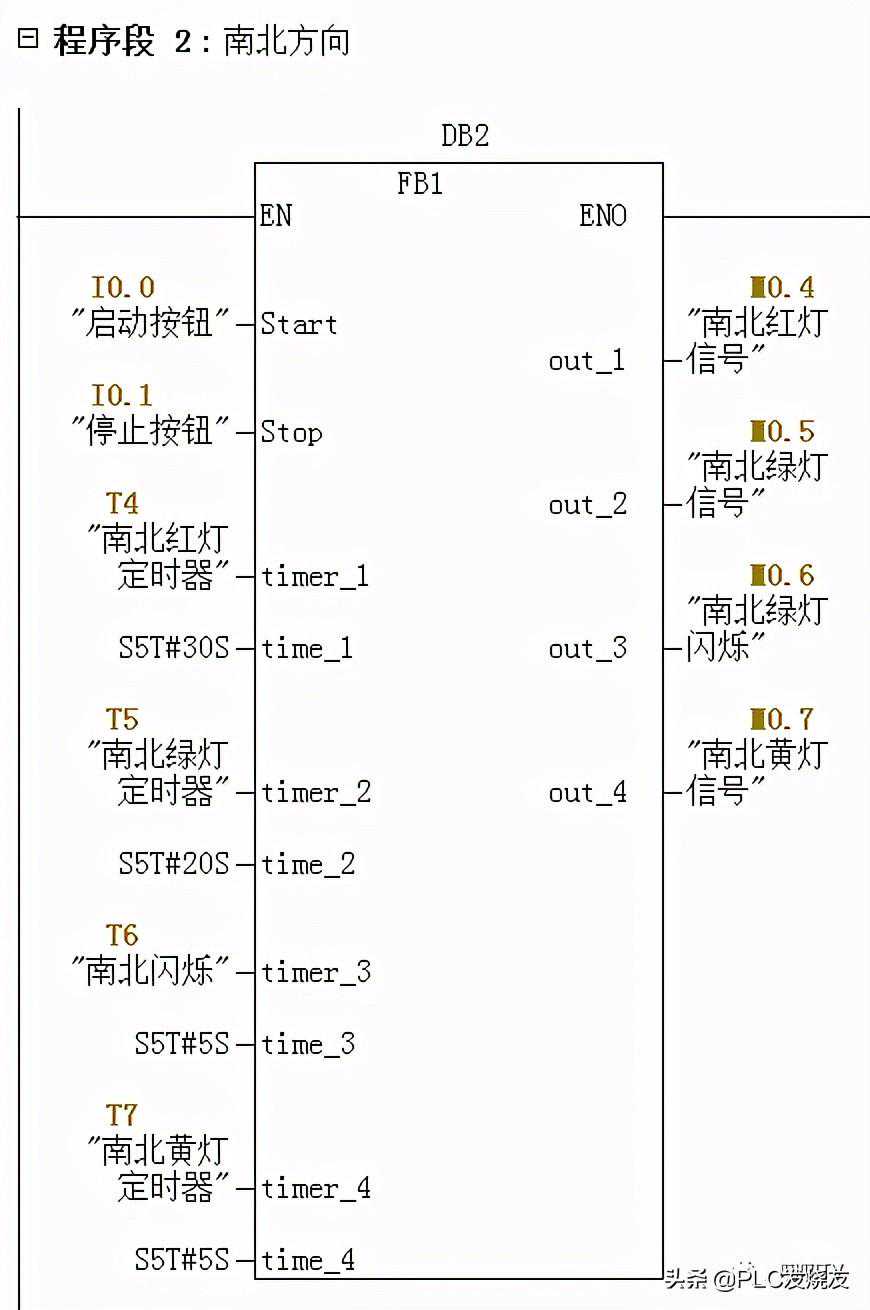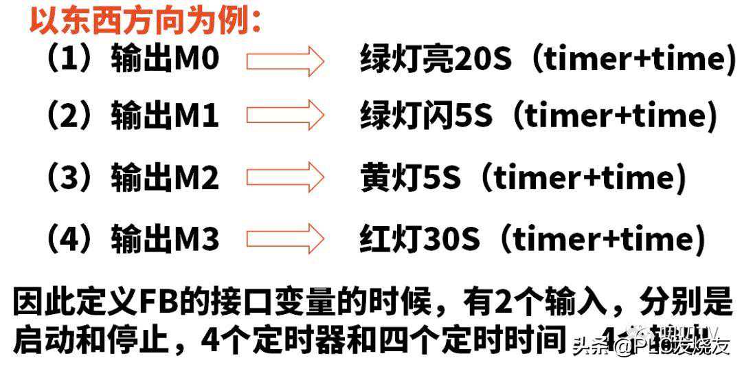 3、分析:不管是东西,还是南北,都是4个状态,因此只需要编写一个FB,重复调用即可。每个状态里都有个定时器,和其设定的时间,一个中继M表示一个输出。