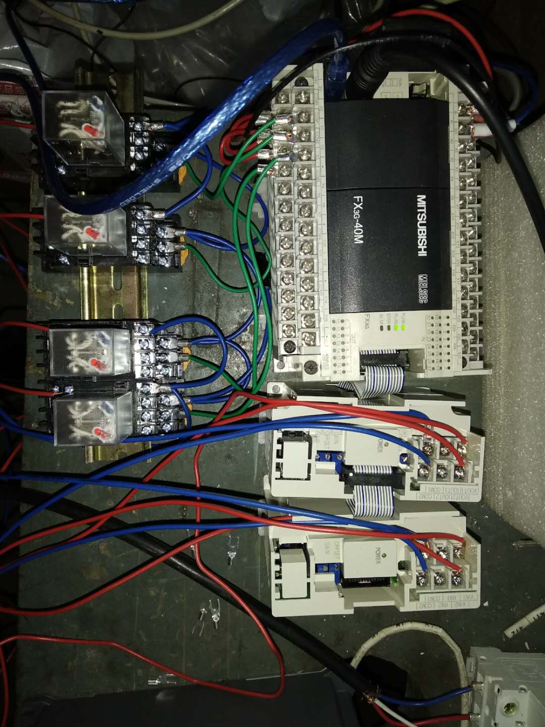 使用的元器件:空开2个、三菱FX3G型PLC一台、维纶MT6071ip触摸屏、FX2N-2DA模块一个、FX2AD模块一个,英威腾变频器两台。