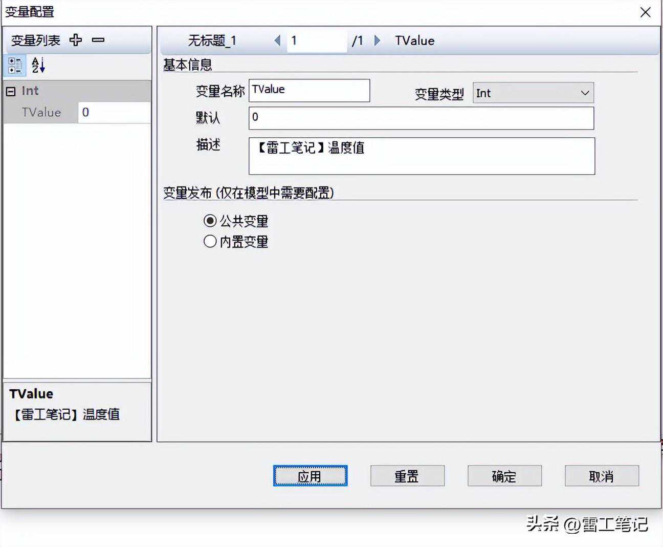 变量名称设置为:TValue,变量类型设置为:Float,初始值:0。