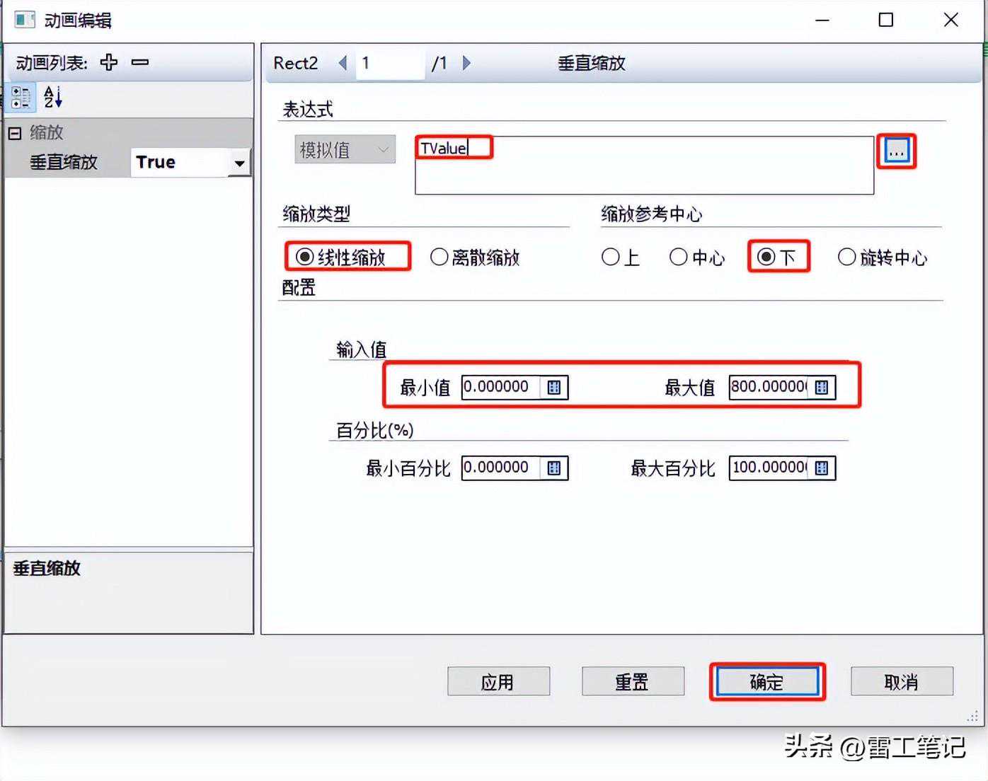选择缩放类型为:线性缩放。选择缩放的参考中心为:下。