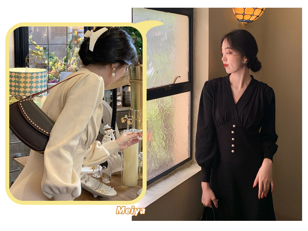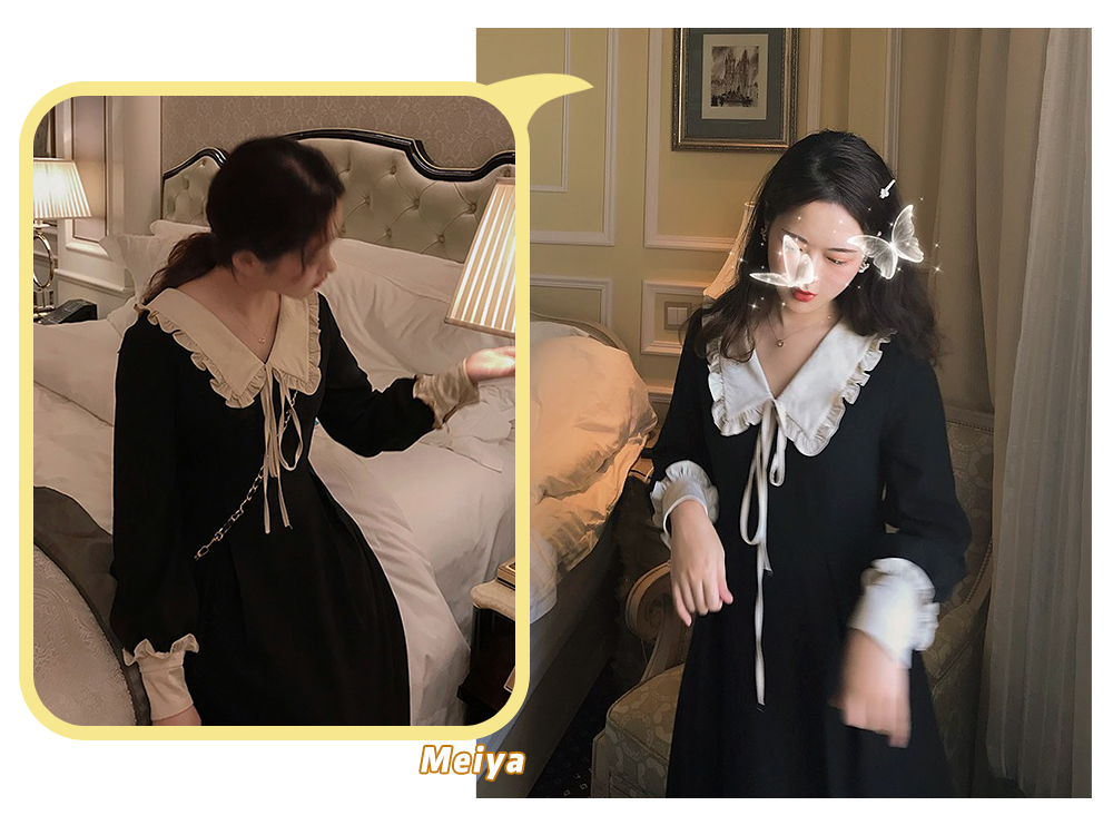 而且呢芽芽觉得娃娃领的连衣裙不但单穿很适合,也很适合叠穿起到1+12的效果,比如和背带裙一起穿,是不是很特别。