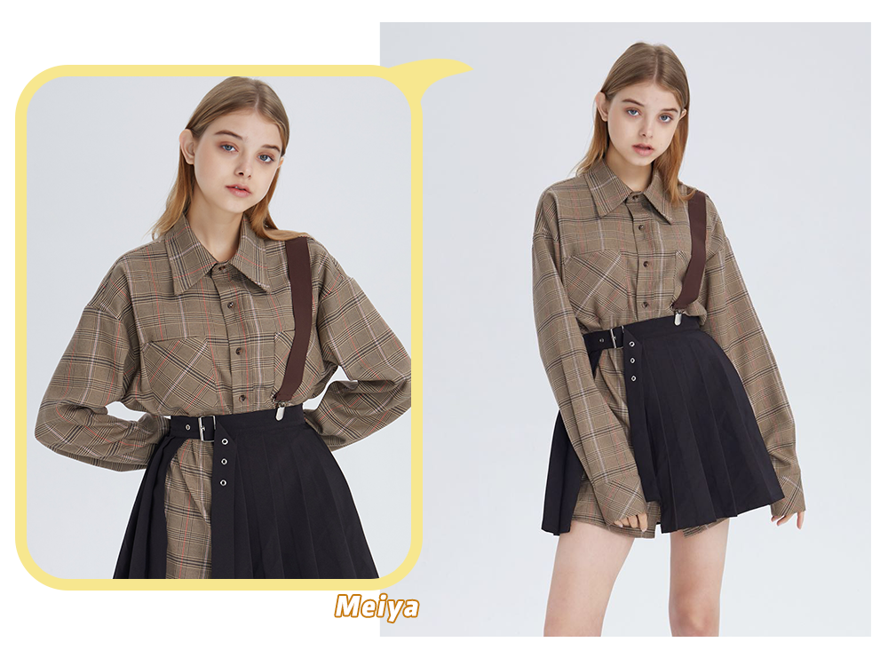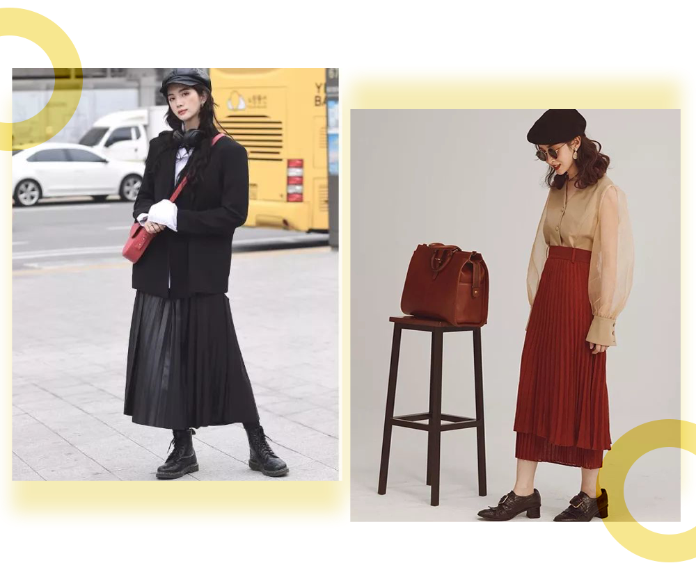 对于芽芽来说,百褶半裙是最经典的款式之一,给人一种慵懒柔美的感觉。尤其是和西装衬衫相搭配,半裙的垂坠感平衡上衣的硬朗,带有一种流动的美感。