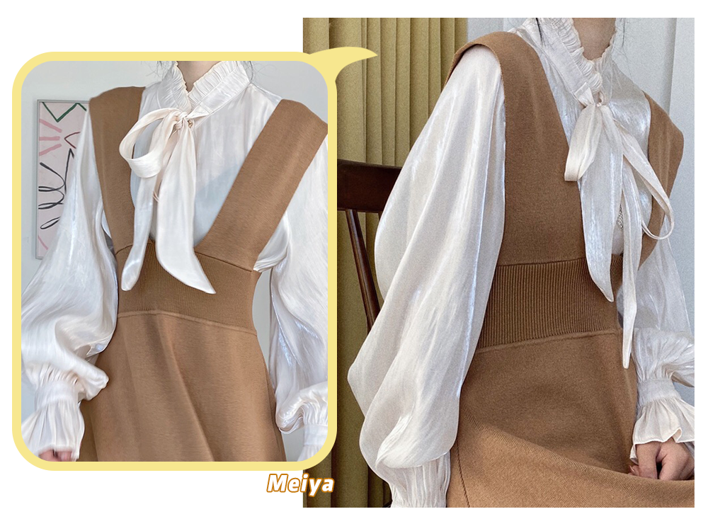你们也可以选择背带款或是大毛衣款的针织裙用来做外搭,满满的学院风哦。