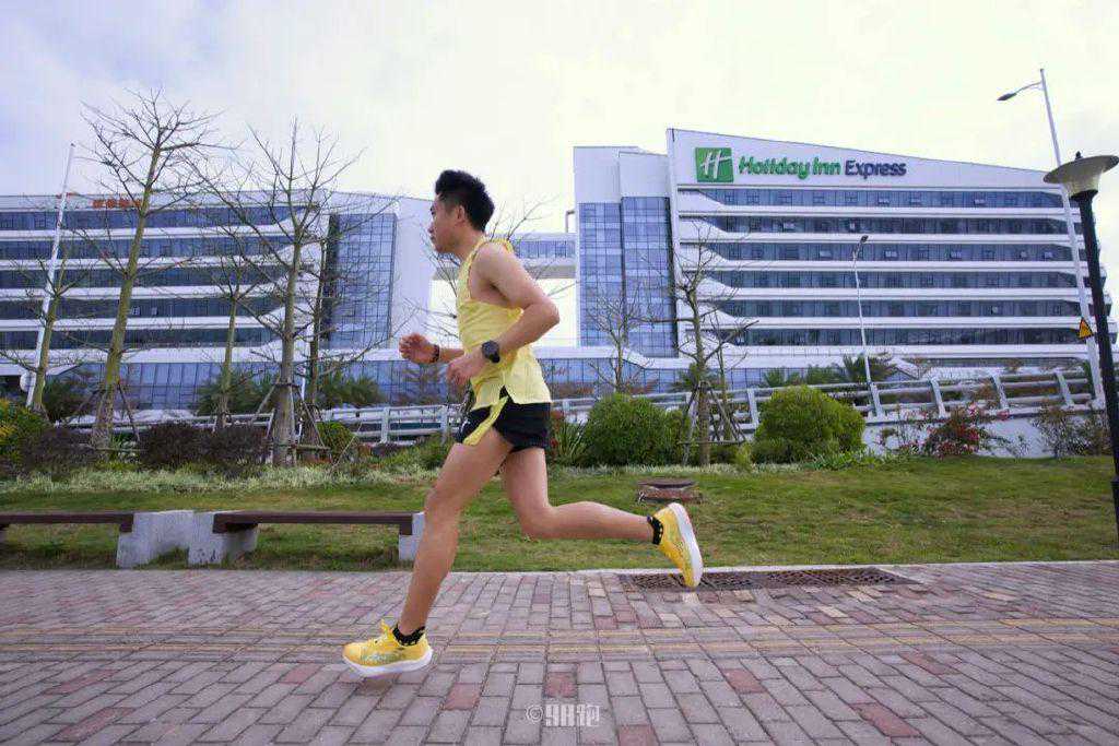 在配速相对较慢时,脚感不是非常软的感受,整体属于软硬适中。驾驭门槛相比其它竞速跑鞋较低,即便是一些石板路、盲道、稍有坑洼的路面,不会有崴脚的情况发生,我想这与中底加宽有关。