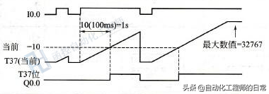 从以上时序图可以看到,在输入信号启动后,定时器T37开始计时。当其内部定时到设置时间后,定时器T37的触点导通,并控制输出IO信号输出。其中在定时器定时到设置时间后,若依然保持接通,那么T37内部会继续定时计数。直至最大值(32767)。上面程序中,定时器T37定时时间设置为10,那么其实际定时时间为10*100ms=1s。上面程序实现了接通后,定时1s,然后输出。