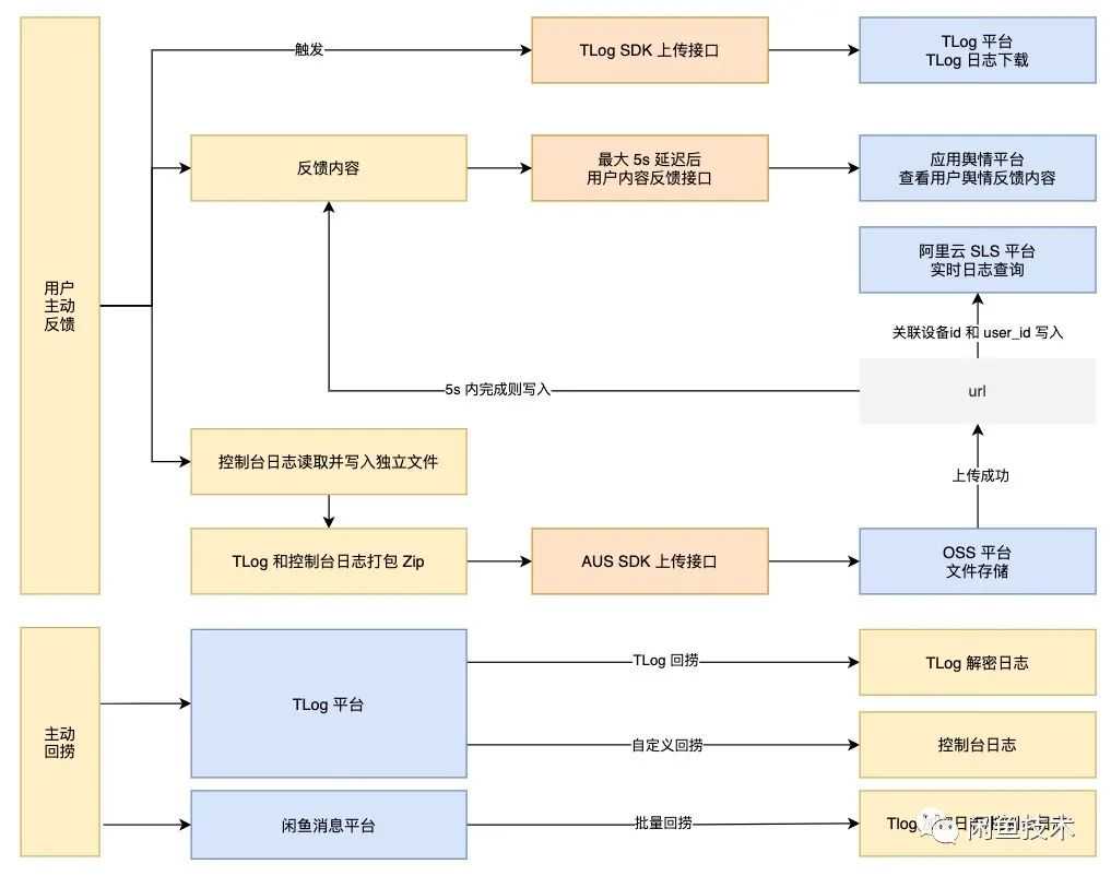 前面提到,由于在线命令推送成功率低且后台无命令缓存机制,所以闲鱼App本地日志回捞困难。为解决日志难以获取问题,舆情治理体系中设计了多种日志回捞策略,见下图所示。