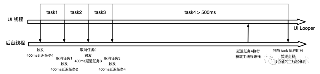 在print方法中时,触发StackSampler工作,即取消上一次异步线程延迟任务,重新触发一次延迟任务,延迟时间为BlockThreshold*0.8f(假设要检测500ms以上的卡顿堆栈,则延迟时间为400ms)。若UILooper任务发生卡顿(BlockThreshold),则延迟任务被执行,且在卡顿期间的获取主线程堆栈信息,之后在下一次print方法被执行的时候,若确认发生卡顿,则可把主线程堆栈信息当做卡顿堆栈记录上报。