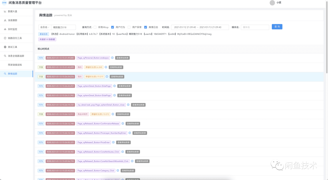 针对关键监控问题,客户端增加对应的SLS实时日志,在自建舆情追踪平台获取用户的在线日志。平台支持用户名和时间查询,同时支持用户行为、用户异常、舆情日志类型的组合查询。