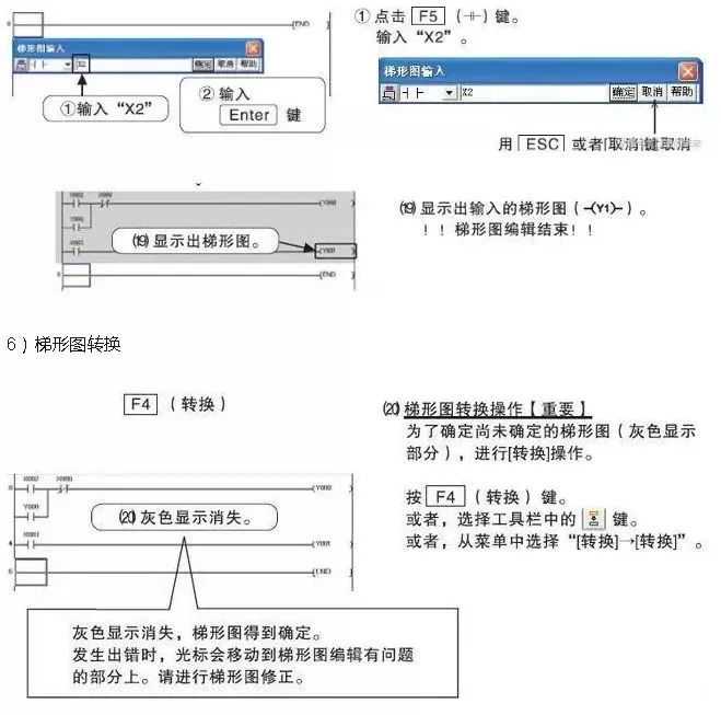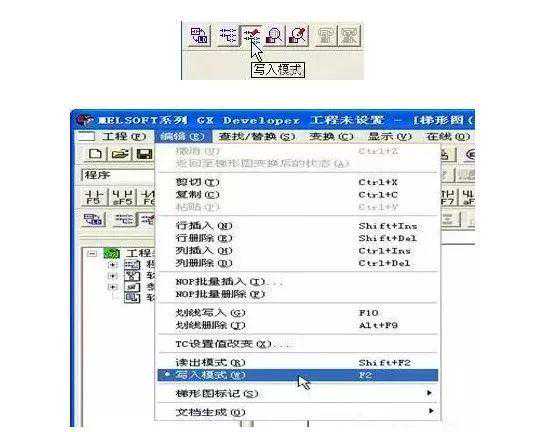 使用功能键或工具按钮编辑梯形图,功能键和梯形图符号关系显示在工具栏的按钮上,编辑梯形图时,必须先设置在“写入模式”。