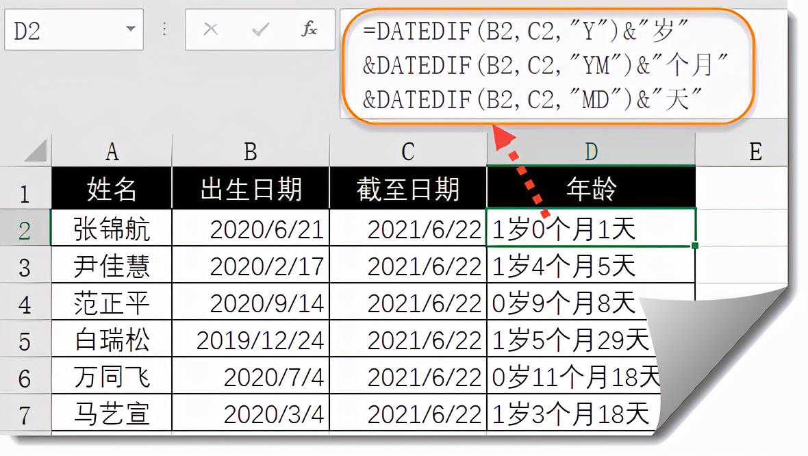 =DATEDIF(B2,C2,"Y")"岁"DATEDIF(B2,C2,"YM")"个月"DATEDIF(B2,C2,"MD")"天"
