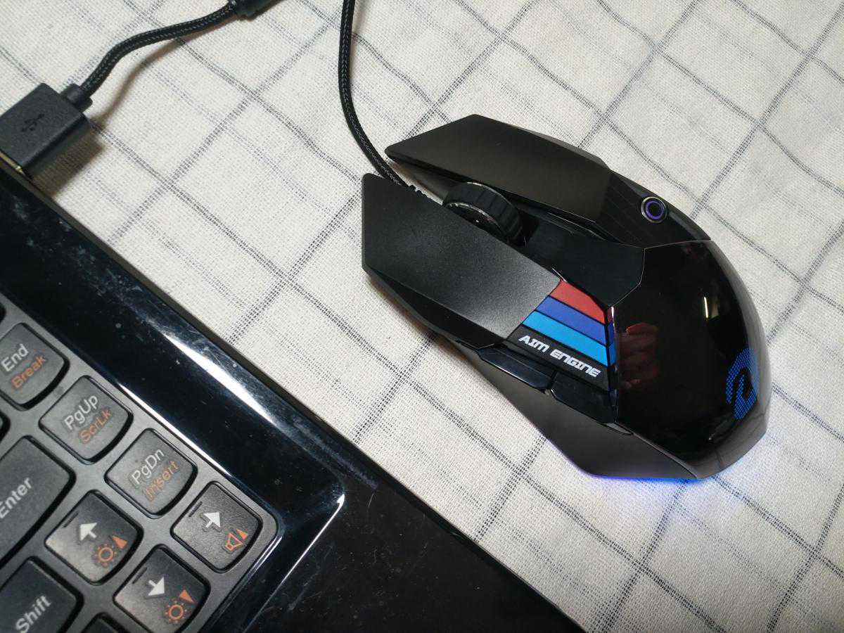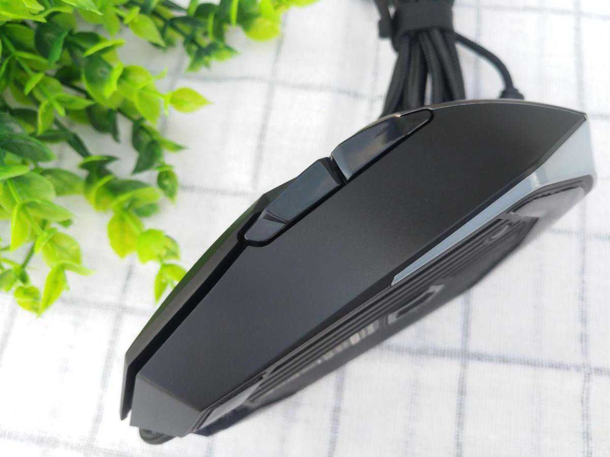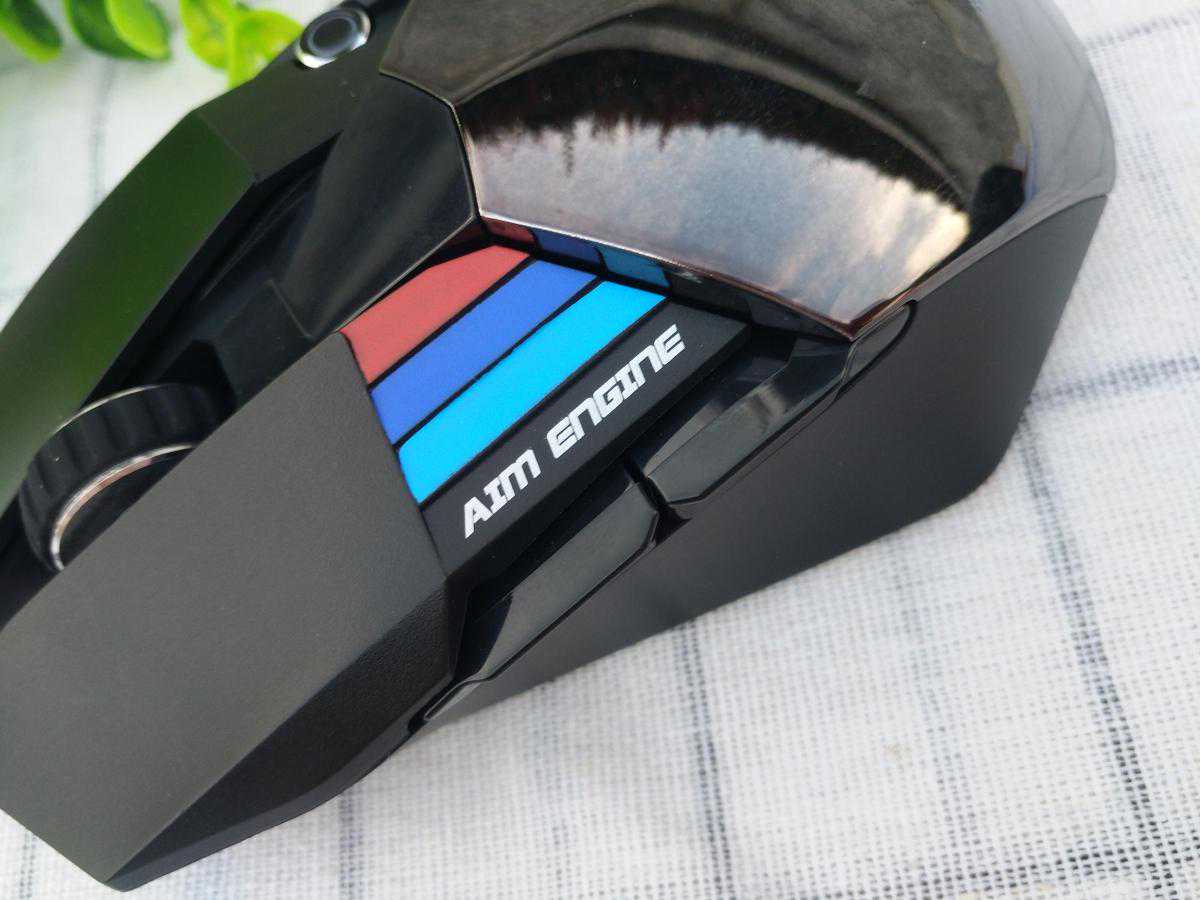 达尔优A970共有6个按键设计,除了常见的左右主键和滚轮键外,还增加有DPI键、前进键和后退键,每个按键都支持自定义功能,可通过相应的驱动进行独立编程。中间左侧有红、深蓝和浅蓝三色条纹设计,还有“AIMENGINE”字符标识,右侧有圆形的DPI键。