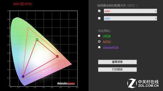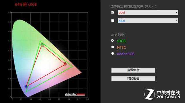 根据Spyder5Elite校色仪的测试结果,这块屏幕拥有64%的sRGB色域和46%的NTSC色域,说明这是一块较为普通的45%NTSC色域屏幕。