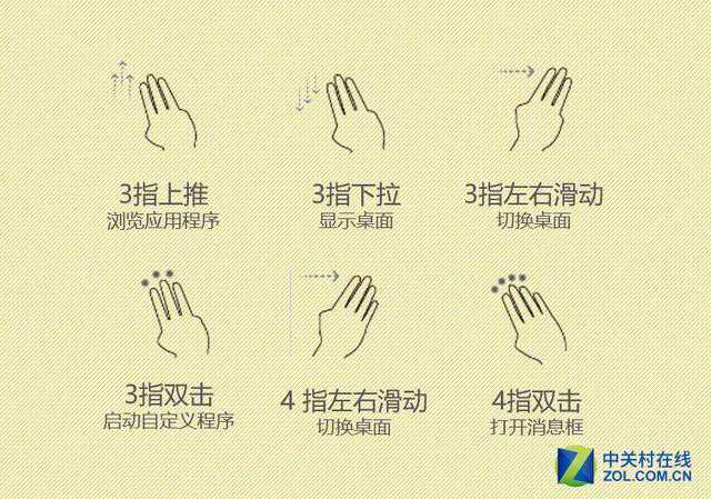 触控板方面,adol笔记本14采用了一体高精度触摸板,不仅触控灵敏,手感也非常细腻,这块触控板还支持多指手势操控,比如3指上推为浏览应用程序,3指下拉显示桌面,3指左右滑动切换桌面等,具体的手势说明可以参考下图。
