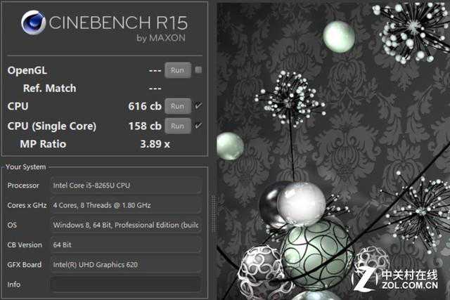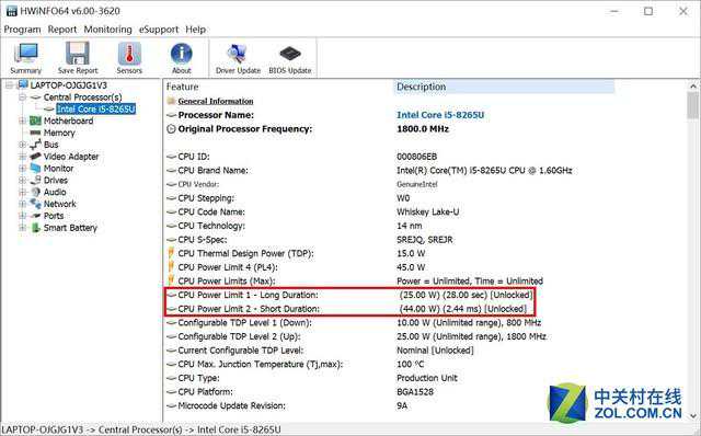 根据HWiNFO的读取,adol笔记本14中的这颗i5-8265U处理器在PL1、PL2功耗上分别是25W和44W,功耗放得比较开,预计性能会很不错。在CinebenchR15的跑分中,这颗处理器的单/多核分数分别是158和616cb,这在目前的i5-8265U中确实是比较高的水平。