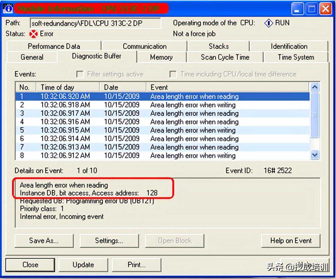 回答:其他冗余同步数据区包括过程映像输出区和M区,如图12所示。主站的数据随时被同步到备用站。过程映像输出区域长度不能超过CPU允许的长度,每个ET200M从节点支持的最大长度为32字节;M区域长度应大于1个字节,且小于CPU允许的值。否则,CPU停止,诊断缓冲区如图13所示。如果没有使用,长度可以设置为0。
