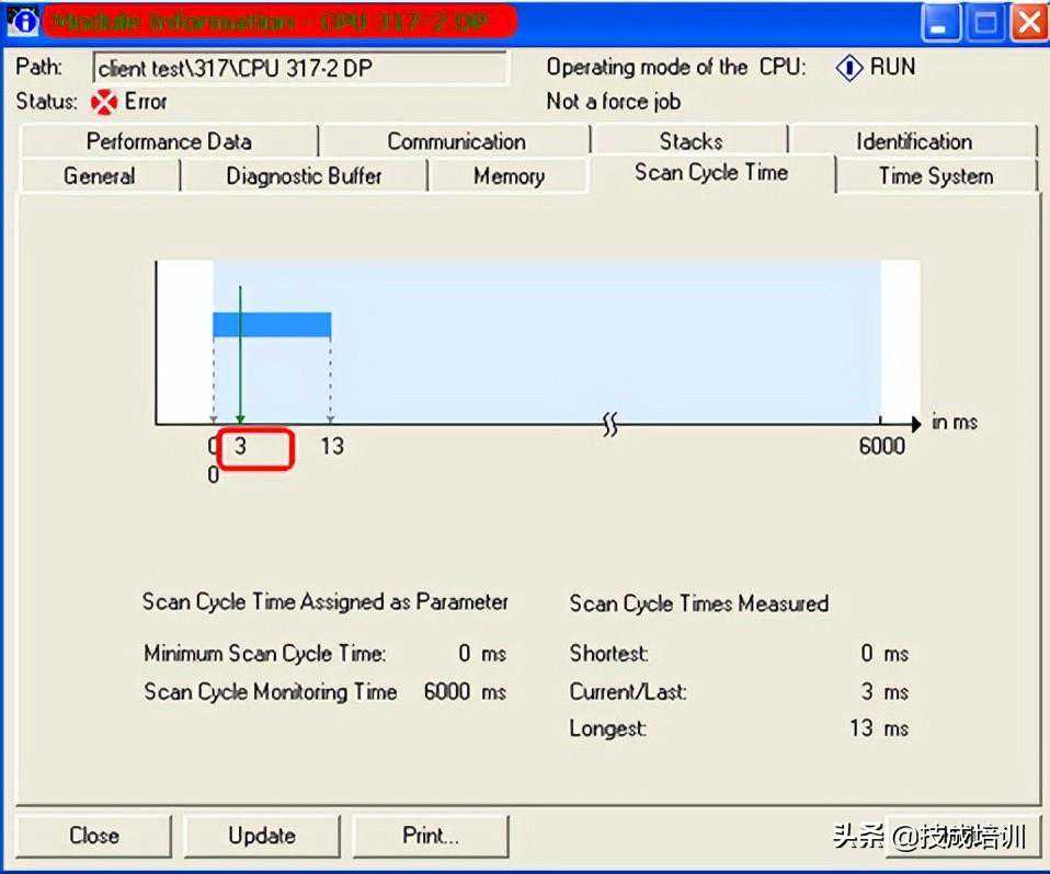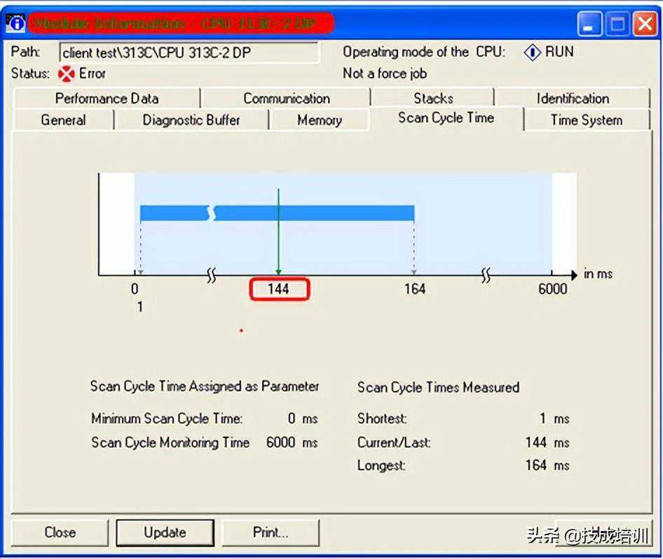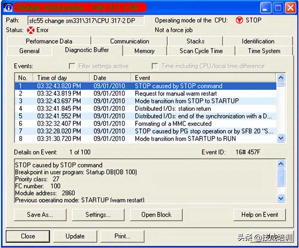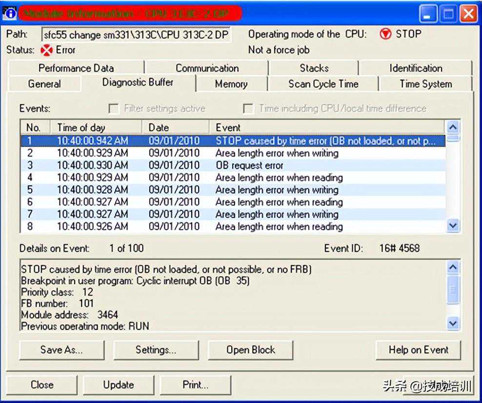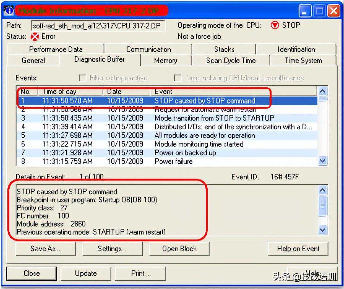 如果在CPU暖启动过程中出现PROFINET总线故障,软件会使CPU停止。诊断缓冲区如图29所示。情况下,CPU不停止,SF灯亮,BF灯闪烁,诊断缓冲区出现总线错误报告。