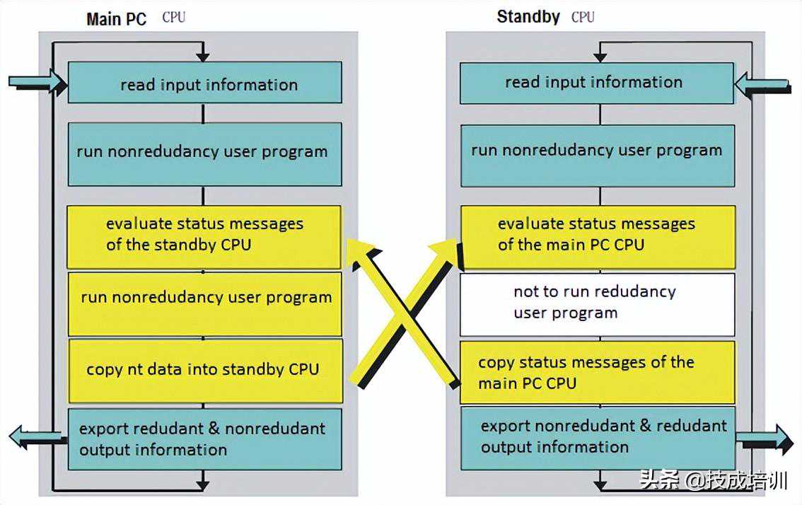 回答:如图24所示,闪烁表示同步有时成功,有时失败。首先,确保两个CPU的冗余/非冗余数据区域的长度相同。其次,主/备CPU同步过程如图25所示。随着FB101“SWR_ZYK”的成功执行,数据同步就实现了。因此,两个CPU的FB101“SWR_ZYK”的调用周期必须相同。FB101“SWR_ZYK”应该在OB35中调用。如果在OB1中调用,请确保OB1的循环扫描周期相似。