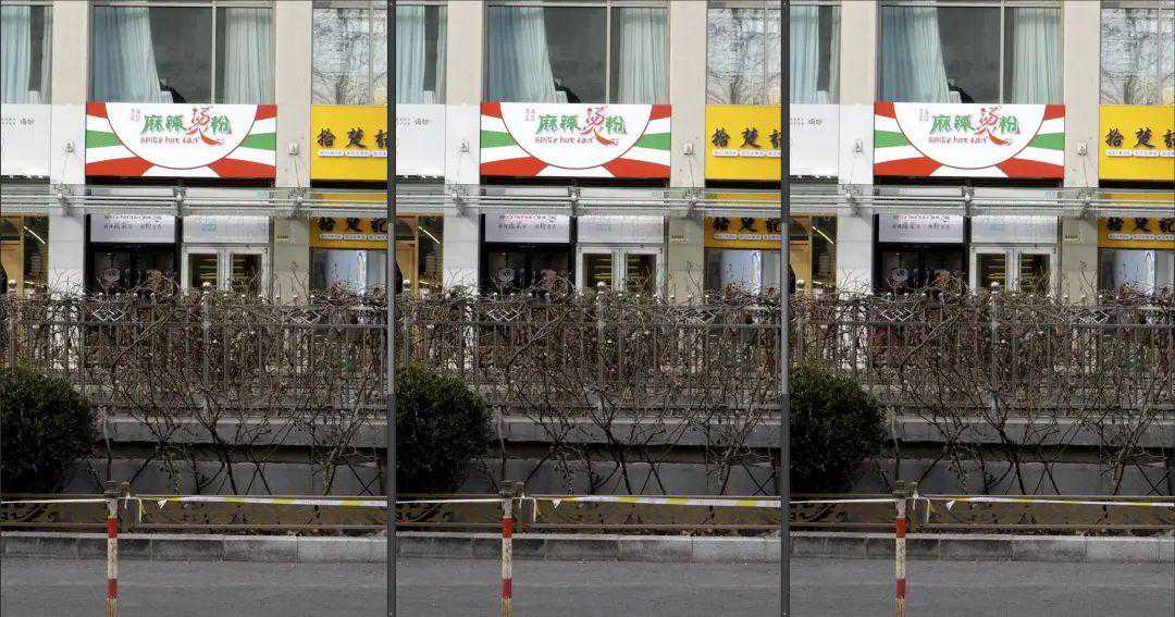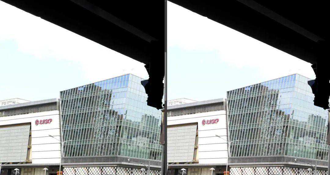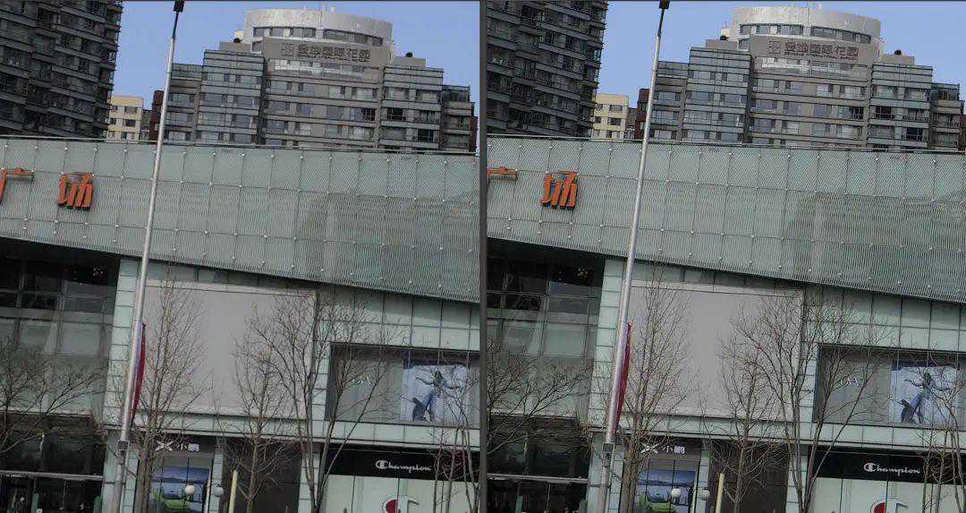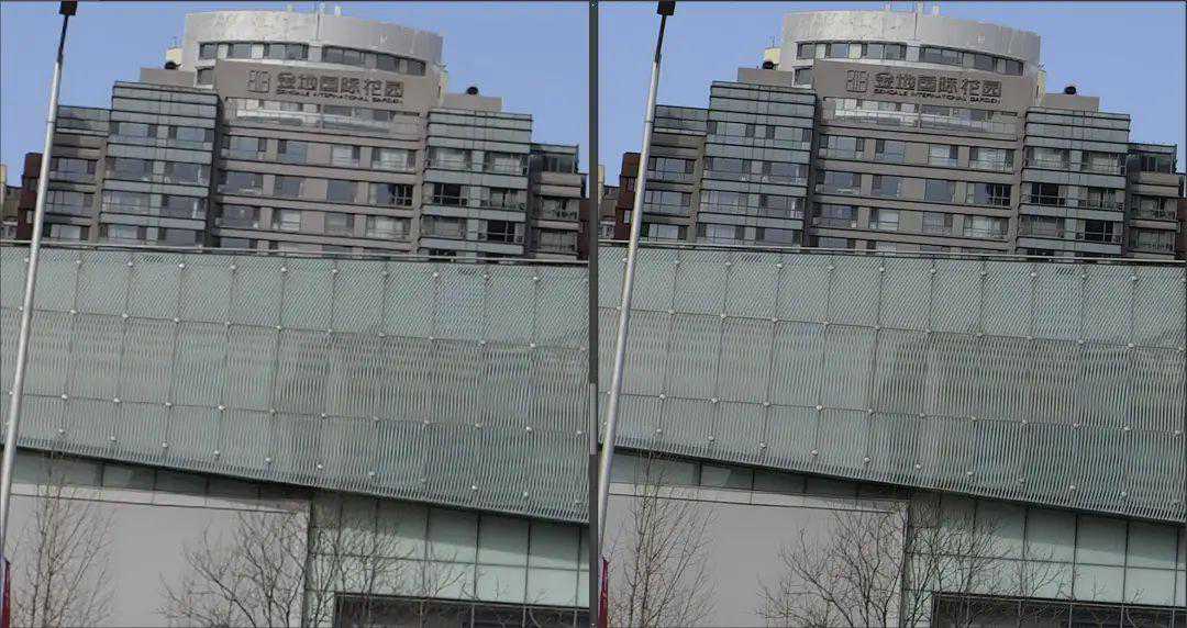 从对建筑物实拍来看,1亿像素和5000万像素的图片尺寸明显更大,建筑物放大到同视角,我们可以看到两种高分辨率模式都要比2500万像素的画面更加清晰(比如文字、线条)。