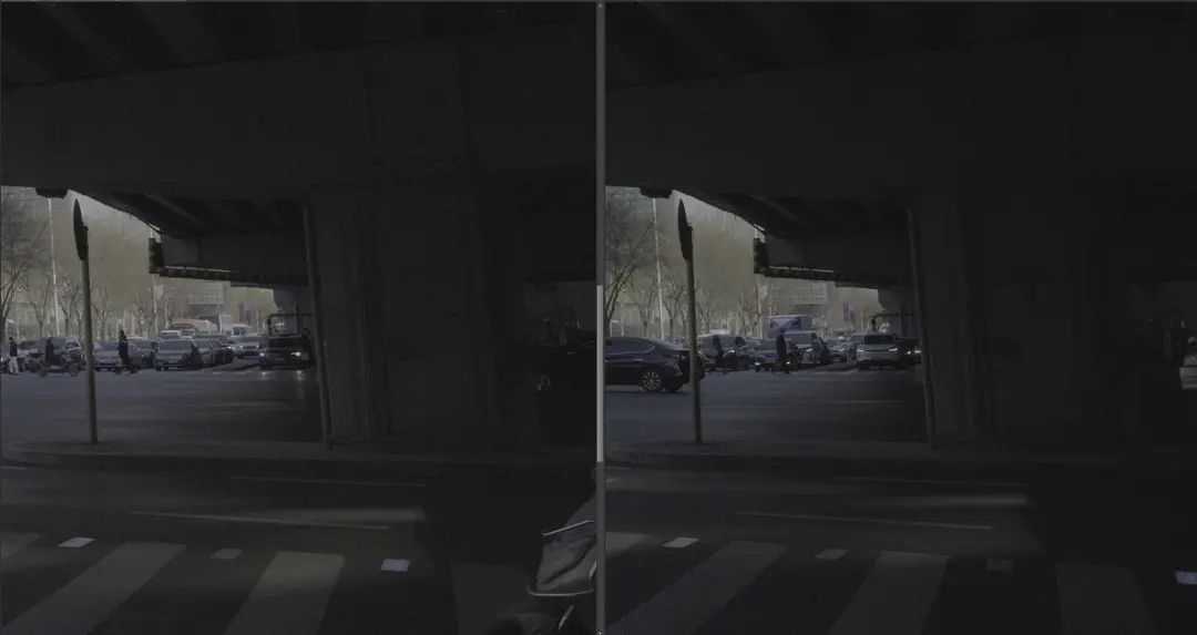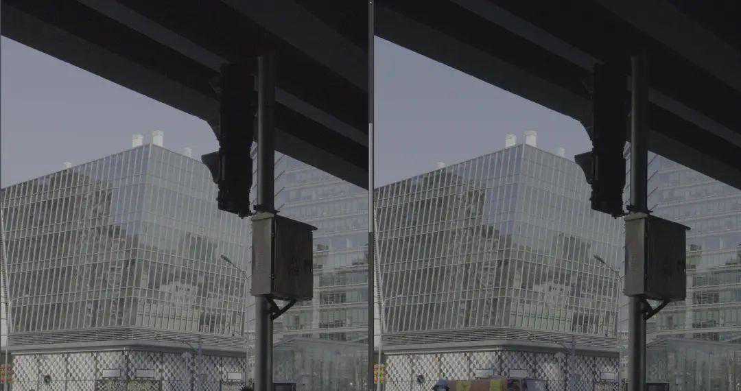 V-Log最低ISO为800,开启“动态范围提升”最低ISO提高至2000,从实拍来看,在标准风格下“动态范围提升”开启后并动态范围几乎没有变化,只是ISO从100提高至800;在V-log下“动态范围提升”开启前后,无论高光还是暗部变化并不大,在暗部会产生明显噪点,相比之下开启“动态范围提升”ISO提升至2000,在马路地面上噪点会更严重一点,粗糙感更强。