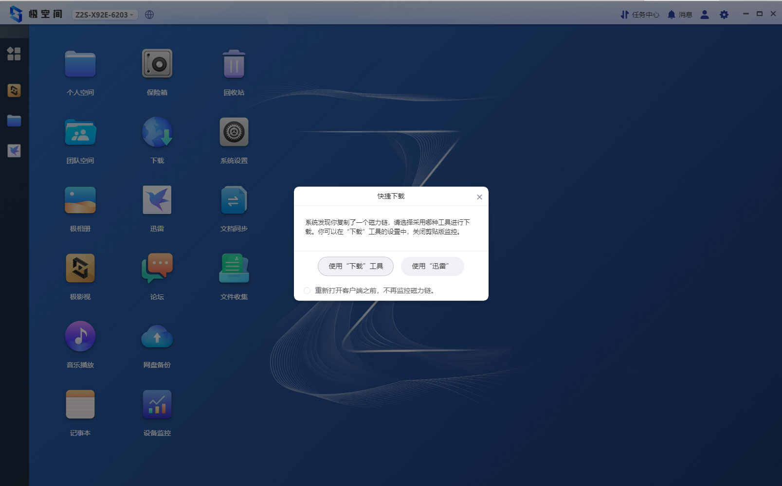如果你复制了磁力链接的话打开极空间是会自动检测并询问我们使用哪个工具来下载,这此细节可以看出极空间每一步都是为用户提高效率来设计的。