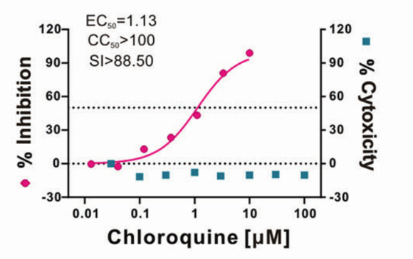 武汉病毒研究所的一项体外研究提示,在细胞水平上磷酸氯喹可有效抑制2019-nCoV的活性,EC50(半数有效浓度)=1.13μM,CC50(半数毒性浓度)100,SI(选择指数)88.5μM。VeroE6细胞对2019-nCoV的EC90为6.90μM,类风湿性关节炎患者给予500mg氯喹,血浆即可以达到这个浓度。