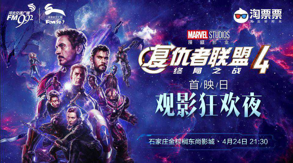 由FM992河北交通广播、FM907河北文艺广播携手淘票票打造的“992通心粉观影团《复仇者联盟4》首映日观影狂欢夜”活动在石家庄金棕榈东尚影城盛大举行,992通心粉观影团团长梁宵、907疯狂粉丝观影团团长焦子现场主持,和广大听友及影迷共同度过了一个难忘的夜晚。
