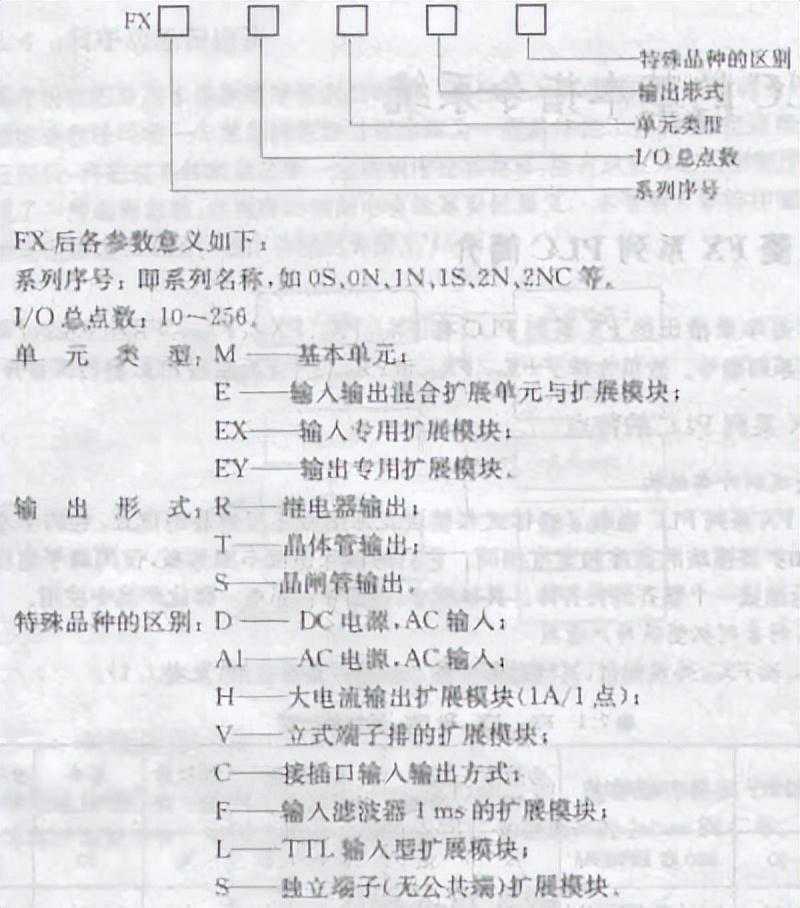 例如FX2N---40MRD,其参数含义为三菱FX2NPLC,有40个I/O点的基本单元,继电器输出型,使用DC24V电源。