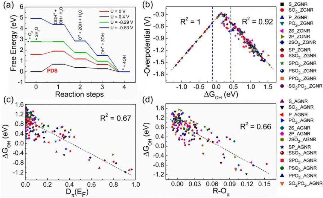 对所有这些136个位点(总共408个DFT计算)上的三种主要中间体O*、OH和OOH进行了碱性ORR计算,并用于绘制自由能曲线。在图2a中,展示了在不同外加电位(U=0V,0.4V,-0.29V,-0.83V)下,2S掺杂6-ZGNR的Z3位ORR自由能(记为Z3_2S@6-ZGNR,其他模型体系也使用类似的符号)。从平衡势(U=0.4V)下的自由能可以看出OOH*中间产物形成的第一步的η值为0.69V。所以对于U=−0.29V,ORR整体过程均为放热反应。因此,ΔGOOH和ΔGOH都可以用作预测ORR活动的能量描述符,而且它们与R2的线性关系为0.96。在这里,作者进一步的研究中考虑了ΔGOH作为一个能量描述符。绘制了ηvsΔGOH的曲线,并发现它们之间有着火山类型相关性。利用ΔGOH与Dπ(EF)和R-Oπ的简单线性拟合方法,得到的R2(拟合优度)分别为0.67和0.66。