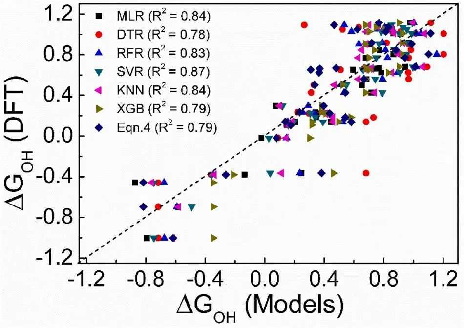 在ML研究中,kfold交叉验证是一项重要的技术,它利用不同的训练/测试集来分析给定数据点的过拟合或选择偏差等问题。在这里使用5折交叉验证方法,使用重复采样技术来筛选ML模型的准确预测能力。在图5中,绘制了使用DFT计算的ΔGOH与使用各种ML预测模型对测试数据估计的ΔGOH的图。通过5折交叉验证方法,我们得到了测试数据集对ML模型的拟合优度(R2),其排序为:SVR(0.87)KNN(0.84)MLR(0.84)RFR(0.83)XGB(0.79)DTR(0.78)。同时应用Eqn(4)对测试数据点的ΔGOH值进行估计,其R2为0.79。