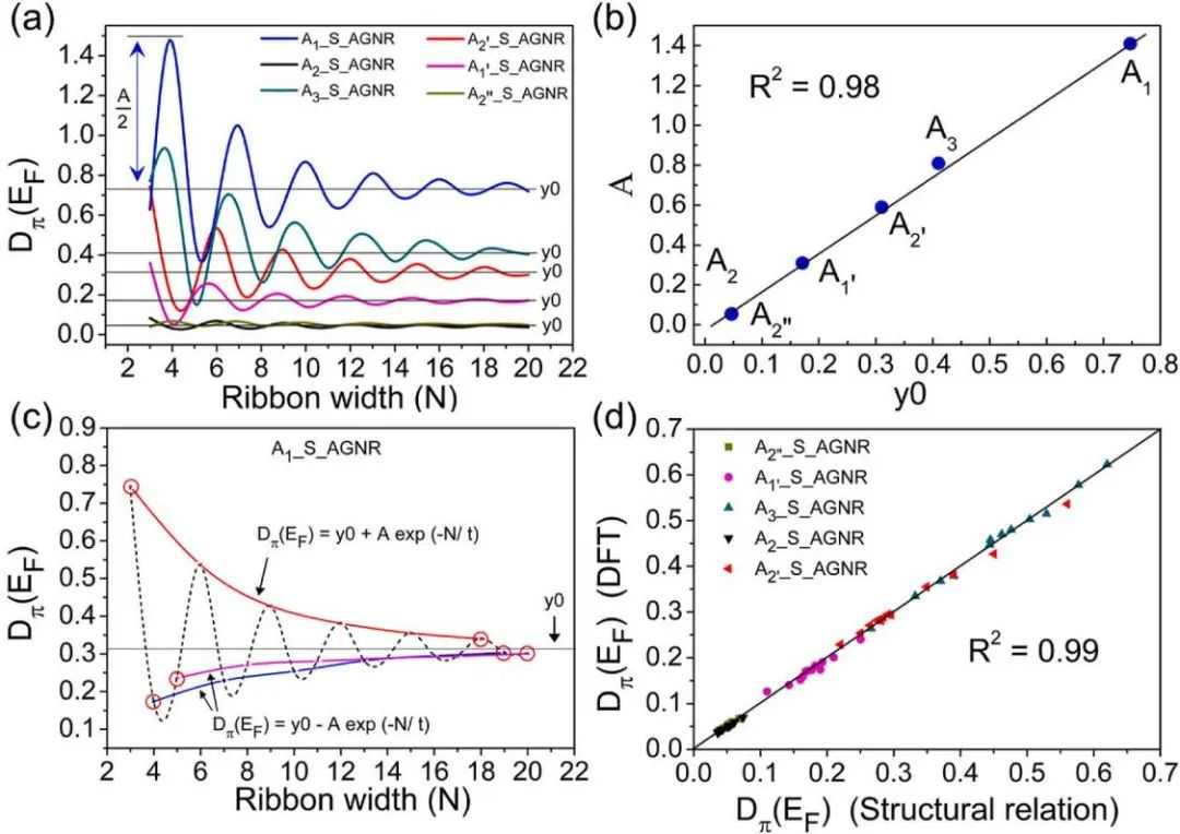 图5(a)显示6个不同活性位点的Dπ(EF)与AGNR宽度之间的关系。(b)阻尼正弦曲线振幅(A)与曲线平均值(y0)的线性相关。(c)表示对AGNR各族阻尼正弦曲线和函数的理解。红色圆圈表示DFT计算的Dπ(EF)值。(d)表示x轴上结构关系预测的Dπ(EF)与y轴上DFT计算的Dπ(EF)值