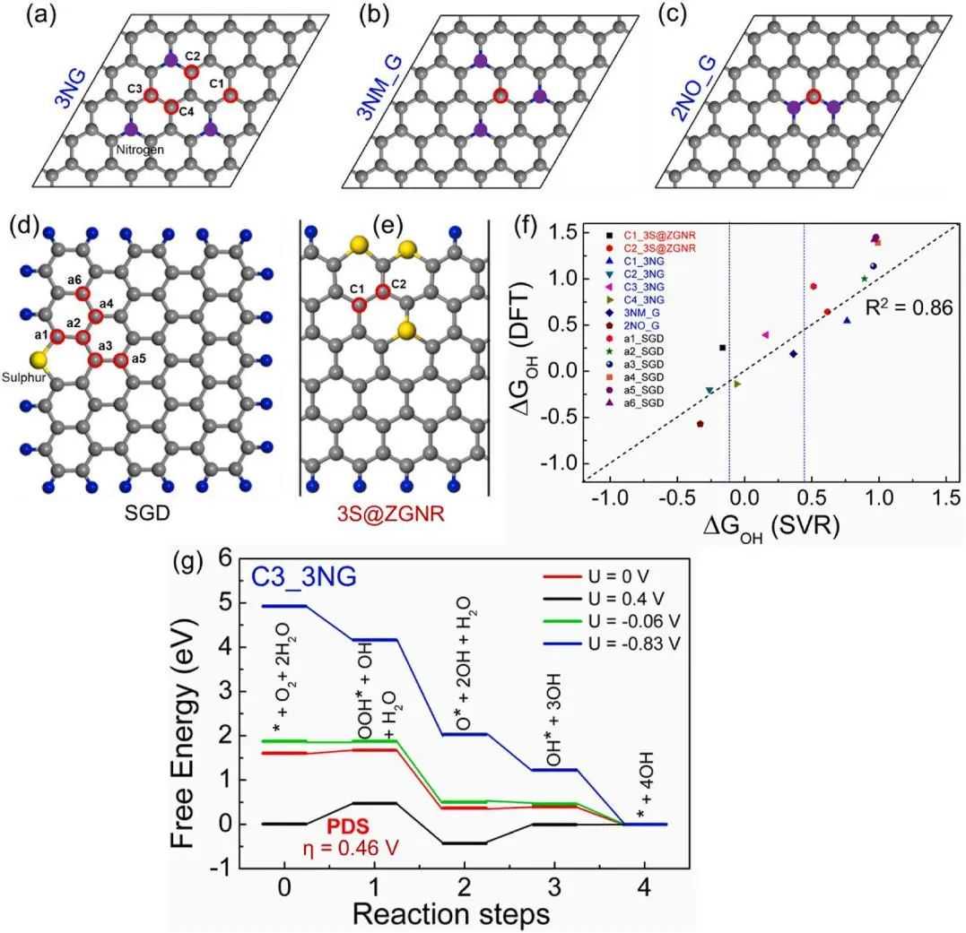 为了验证本文提出的SVR模型的预测熟练性和推广性,作者选择了不同类型的石墨烯系统,如3个氮掺杂的2D石墨烯(3NG,3NM_G,2NO_G),3个硫掺杂的1D石墨烯6-ZGNR(3S@ZGNR)和硫掺杂的0D石墨烯量子点/薄片(SGD)(图6a-e)。SVR模型的验证考虑了这些系统的少数可能的活性位点,用红色空心圈标出。研究表明,SVR算法建立的预测模型在估计任意碳位点的能量参数(ΔGOH)值时表现良好(图6f)。而预测值ΔGOH与DFT计算值的拟合优度(R2)为0.86。因此,与传统的DFT方法相比,这种QM/ML方法具有很高的成本效益和速度。最终,所提出的SVR预测模型可应用于具有不同掺杂剂/边缘/异质结构/缺陷的石墨烯体系的快速筛选,以发现ORR碳催化剂中的活性构型。