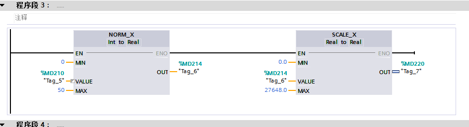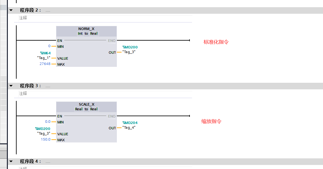 标准化指令OUT=(VALUE–MIN)/(MAX–MIN),即输入值转化为量程MIN-MAX的比例,缩放指令OUT=[VALUE∗(MAX–MIN)]+MIN,将输入值转换成模拟量实际值,MIN和MAX是传感器的测量范围。