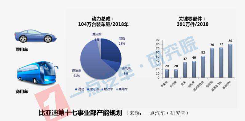 一直以来,该事业部服务于比亚迪的乘用车产业群、商用车产业群和云轨产业群,为后者配套核心零部件。部门自2004年8月成立以来,14年光阴如梭,发展至2018年,第十七事业部动力总成(涵盖燃油车、混动车、商用车及纯电动车)的产能规划达104万台装车量,关键零部件的产能规划则为391万件。