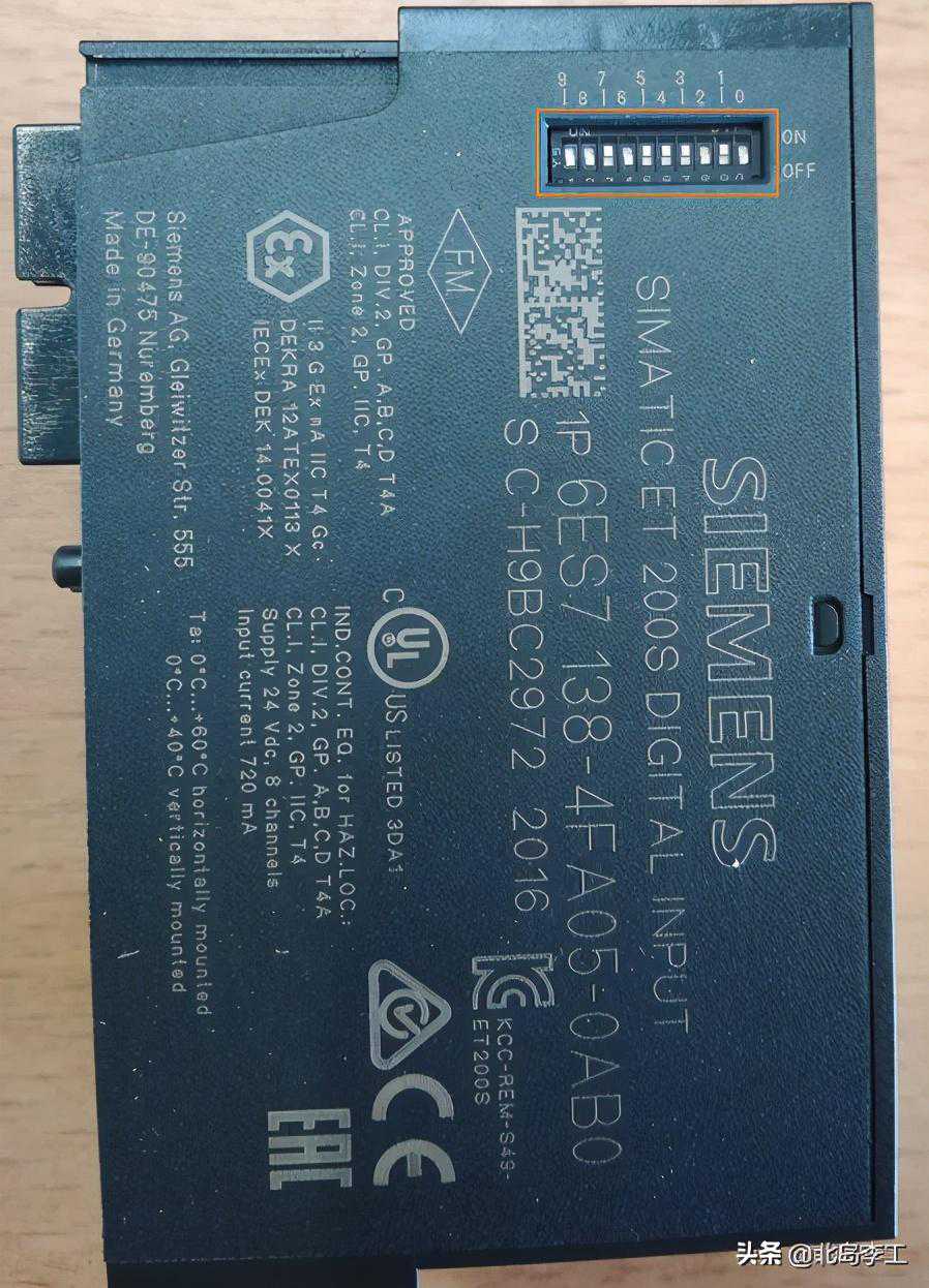 比如下面这张图是ET200S的一个故障安全数字量输入模块,模块的上部是一组DIP开关,总共有10个,最右边编号为0,往左依次增加。开关拨到上面ON位置表示数字1,拨到下面OFF位置表示数字0;