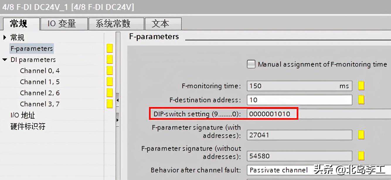 在硬件组态中,目标地址下面会显示DIP开关设置值,只需要按照该值将相应的DIP拨到ON或OFF位置就可以了,如下图所示: