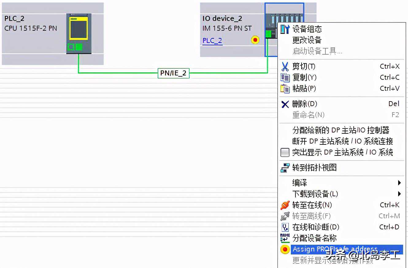 打开博途开发环境,在【网络视图】中选中要分配地址的子站,单击右键,在弹出的对话框中单击【AssignPROFIsafeaddress】,如下图所示:
