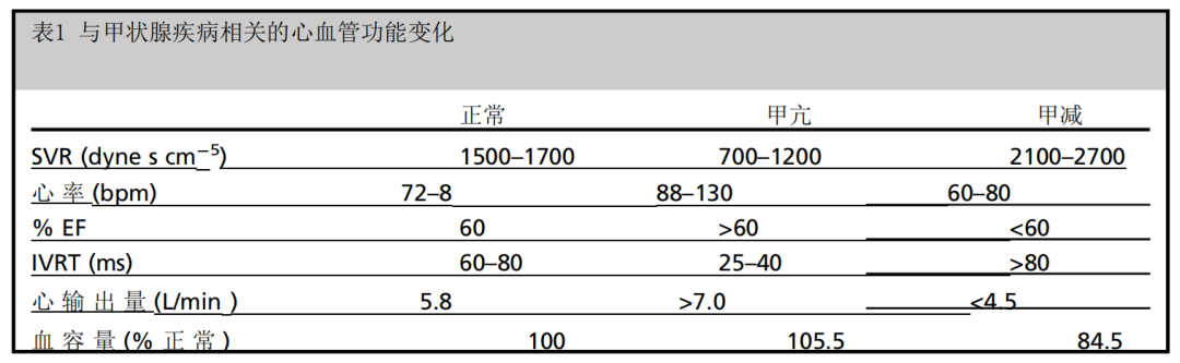 甲亢患者的心脏收缩力增强,心输出量和静息心率增加。收缩和舒张功能增强,全身血管阻力和后负荷降低。心血管血流动力学增强,导致血流和组织灌注增加。在老年患者中,甲亢可表现为心律失常伴心动过速、脉压增宽和劳累时呼吸困难。甲减与甲亢相反,患者可能发生心动过缓、舒张性高血压和脉压变窄。患者的心脏收缩力降低,全身血管阻力增加。