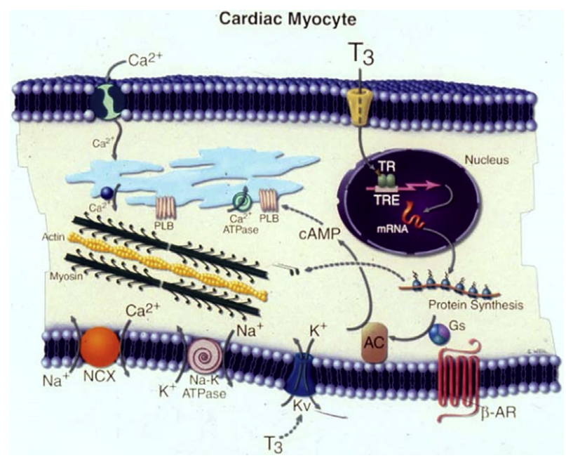 此外,TH对心肌细胞和全身血管系统还有核外非基因组效应,如T3介导的钠、钾和钙离子通道的变化。总体而言,T3的非基因组和基因组效应可调节心脏功能和心血管血流动力学。