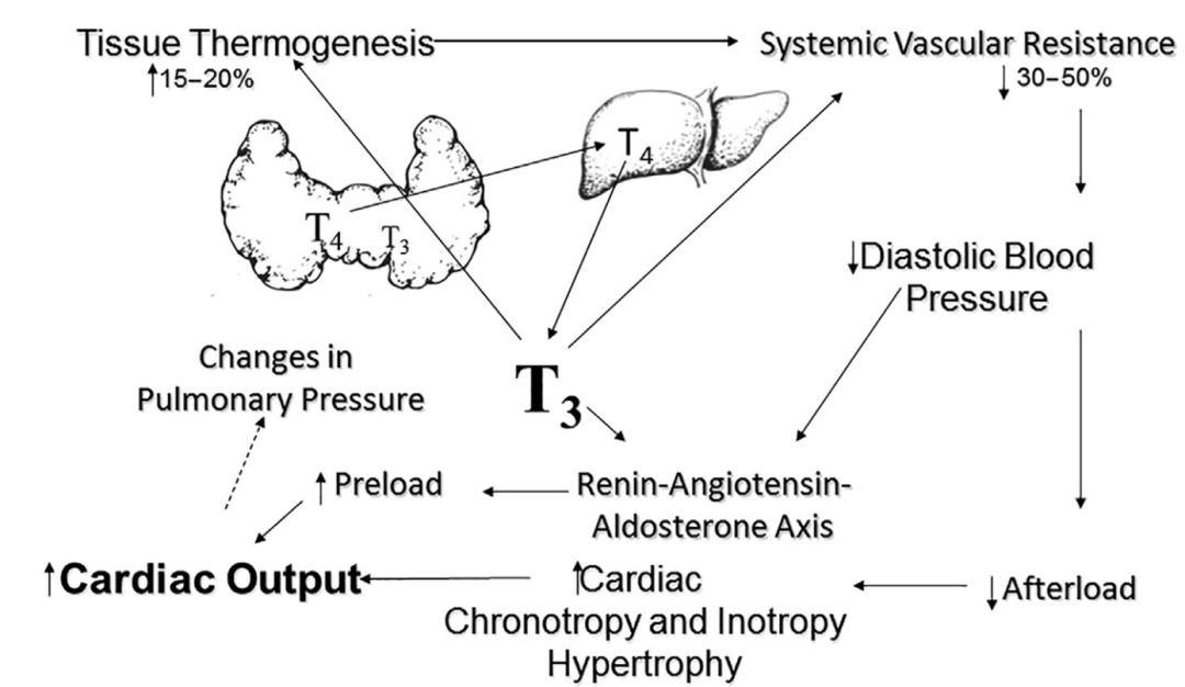 此外,T3可通常直接作用于血管平滑肌,以及血管内皮的变化来降低全身血管的阻力,增加心输出量。