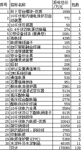 30类物资中,线路类占比超出常规,4类线路类的过亿元,合计43包118967万元,占总金额的66.8%。水泥杆及水泥制品11包48165万元居首,10千伏电力电缆-优质12包32643万元居次,架空绝缘线10包22058万元第三,10千伏铁附件10包16101万元第四,10千伏及以下配电绝缘子8包8135万元第五。设备类的物资规模并不大,HPLC采集通信单元10包5895万元第六,10千伏油浸式变压器5包5134万元第10,台区智能融合终端4包3121万元第13。具体见后表。
