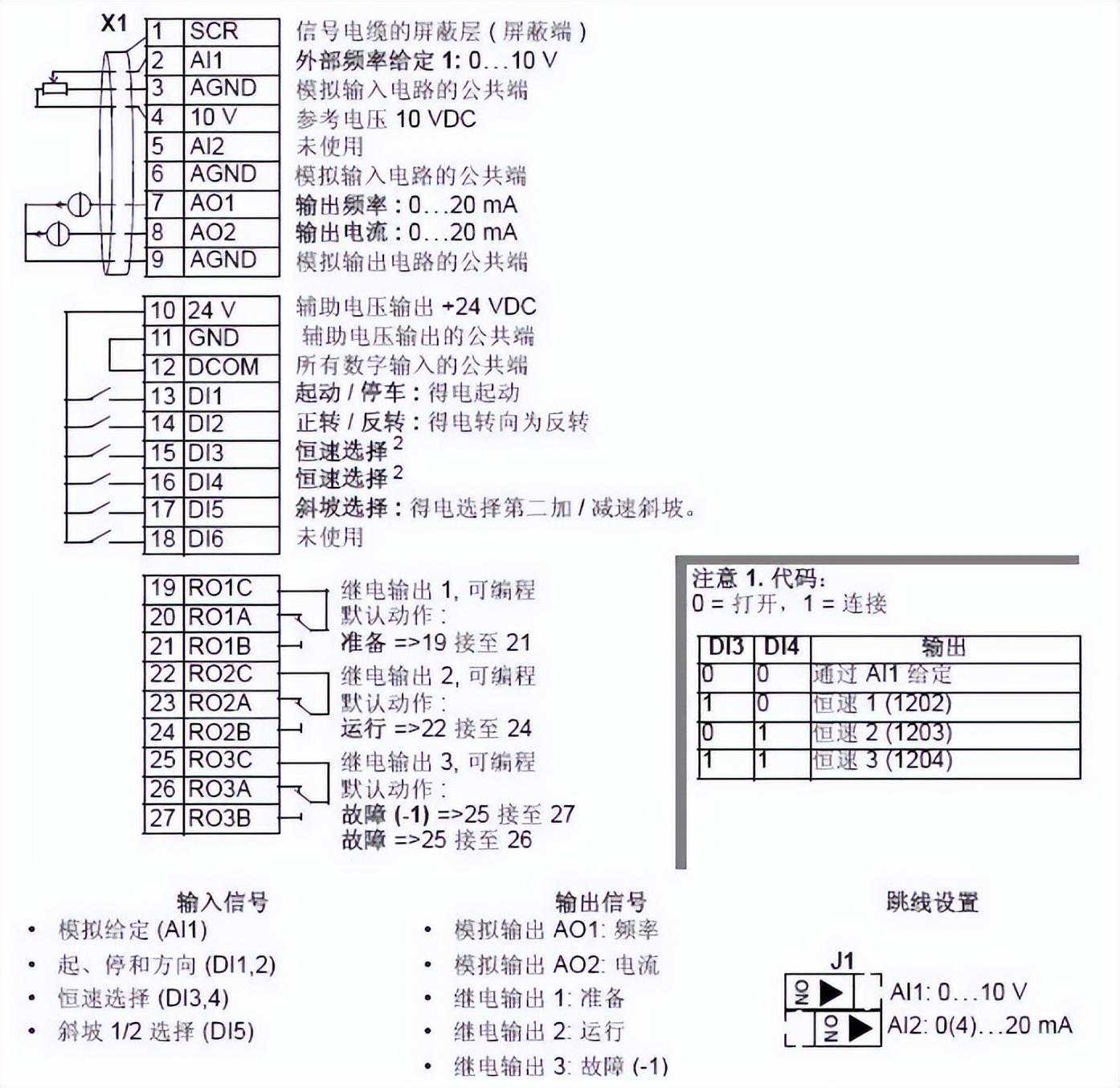 ①在变频器通电之前,检查确认功率电缆、控制端子的接线正确无误。下图的是ABB标准宏的端子接线与定义图。