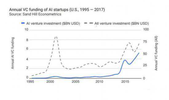 2018年美国AI创业公司的数量,比2015年增长2.1倍。而从2013年到2017年,美国AI初创企业获得的融资额增长了4.5倍。