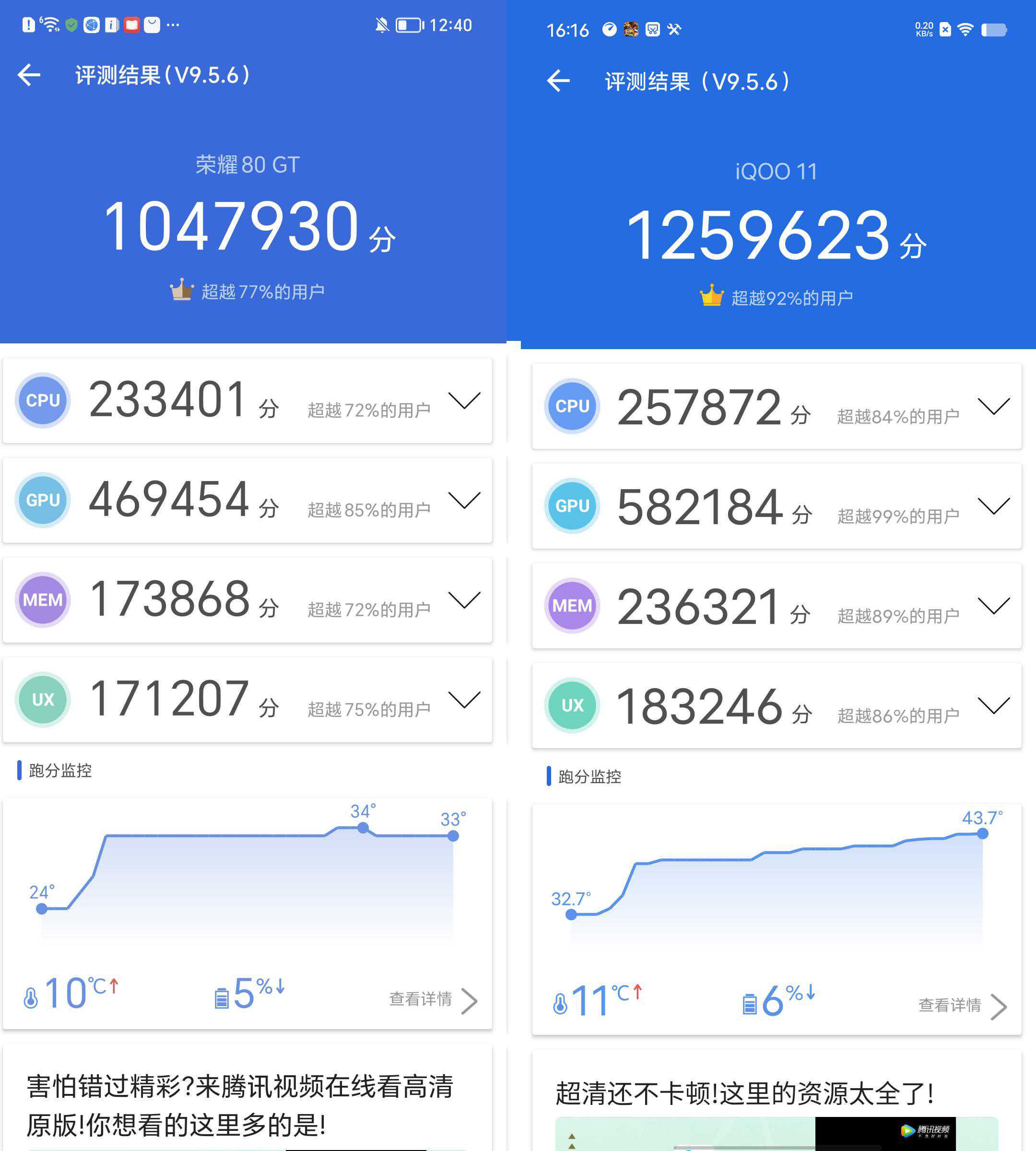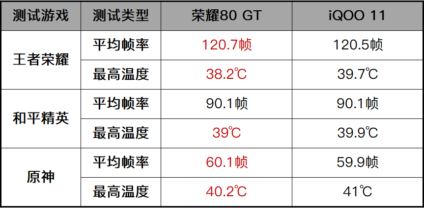 虽然荣耀80GT的跑分不如iQOO11,但是二者在帧率和温控方面的表现几乎一致,差异并不大。