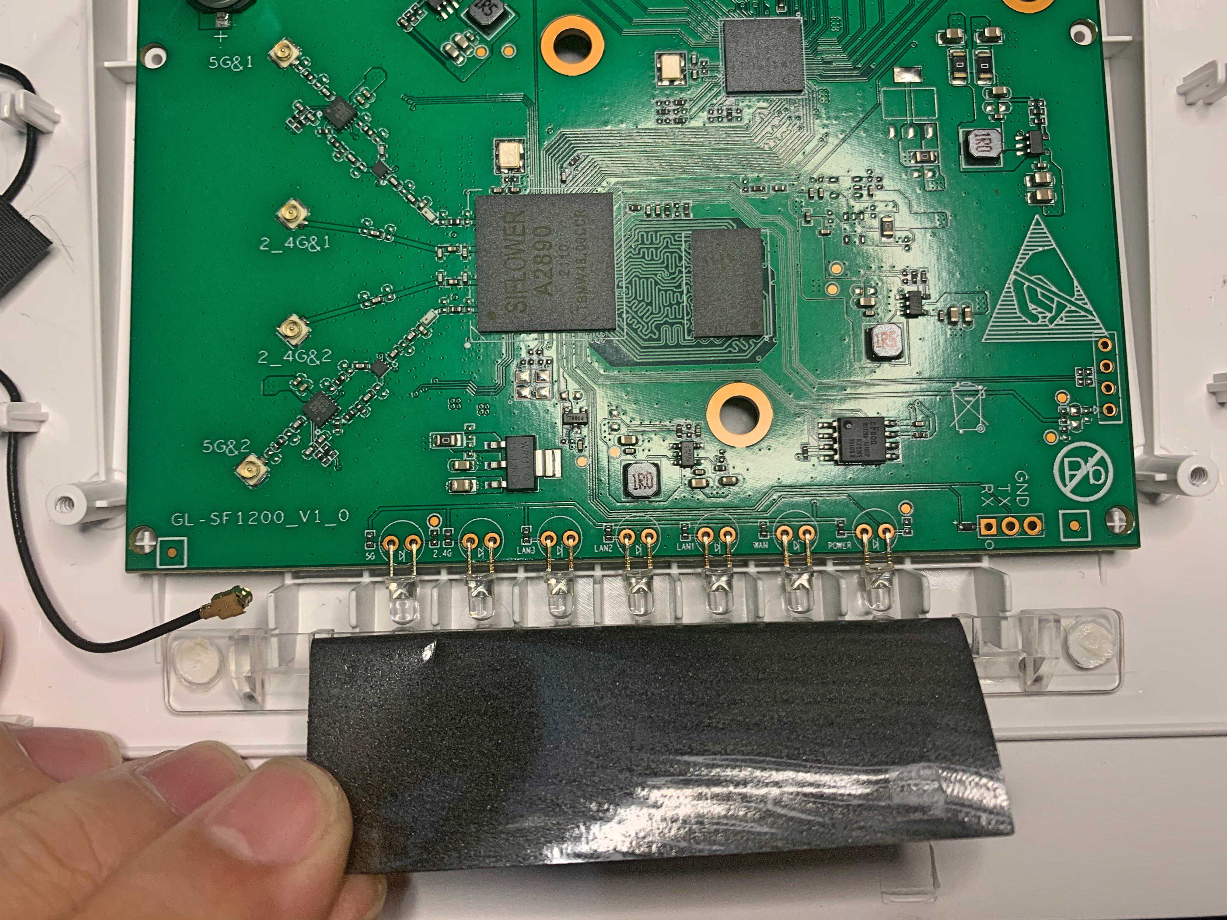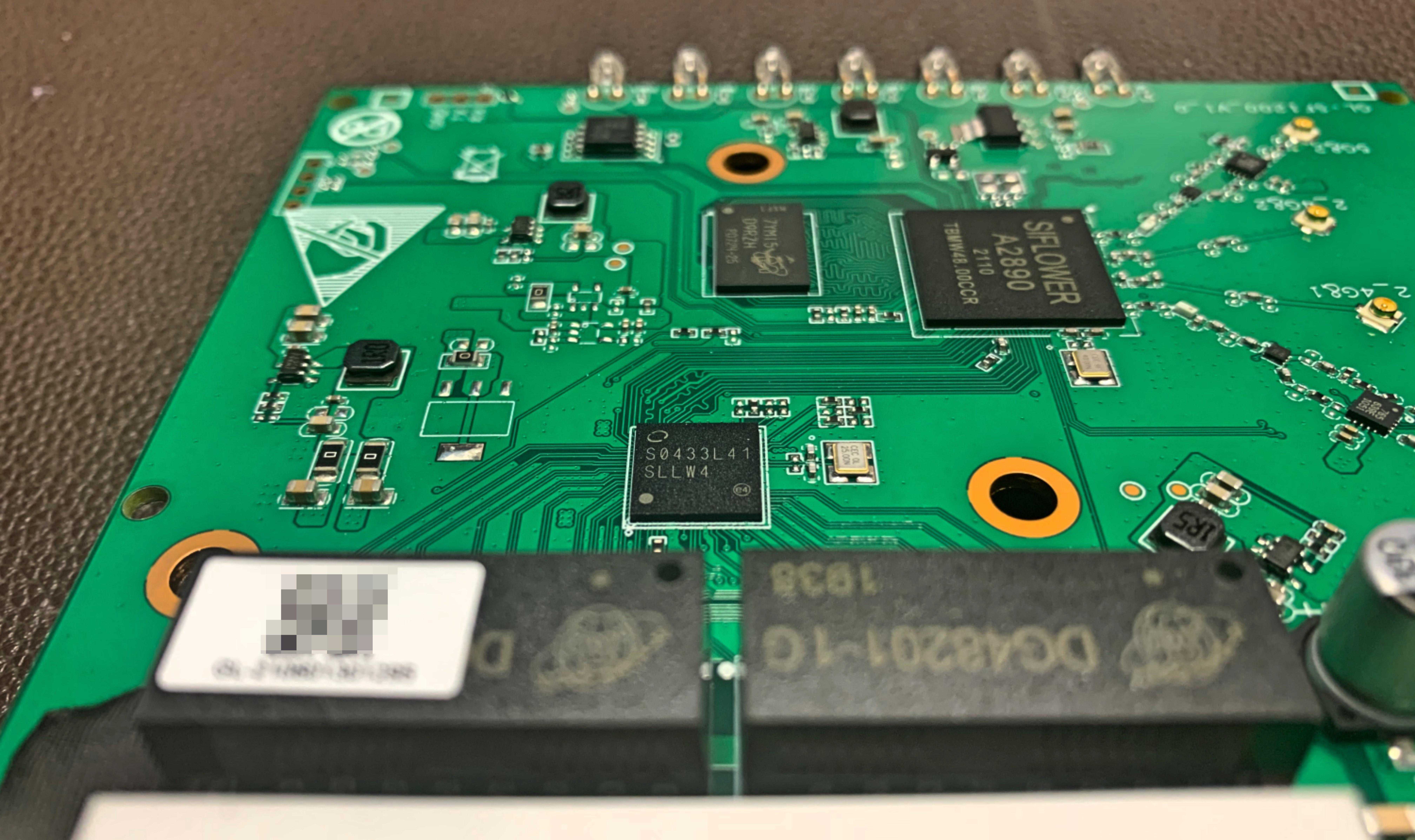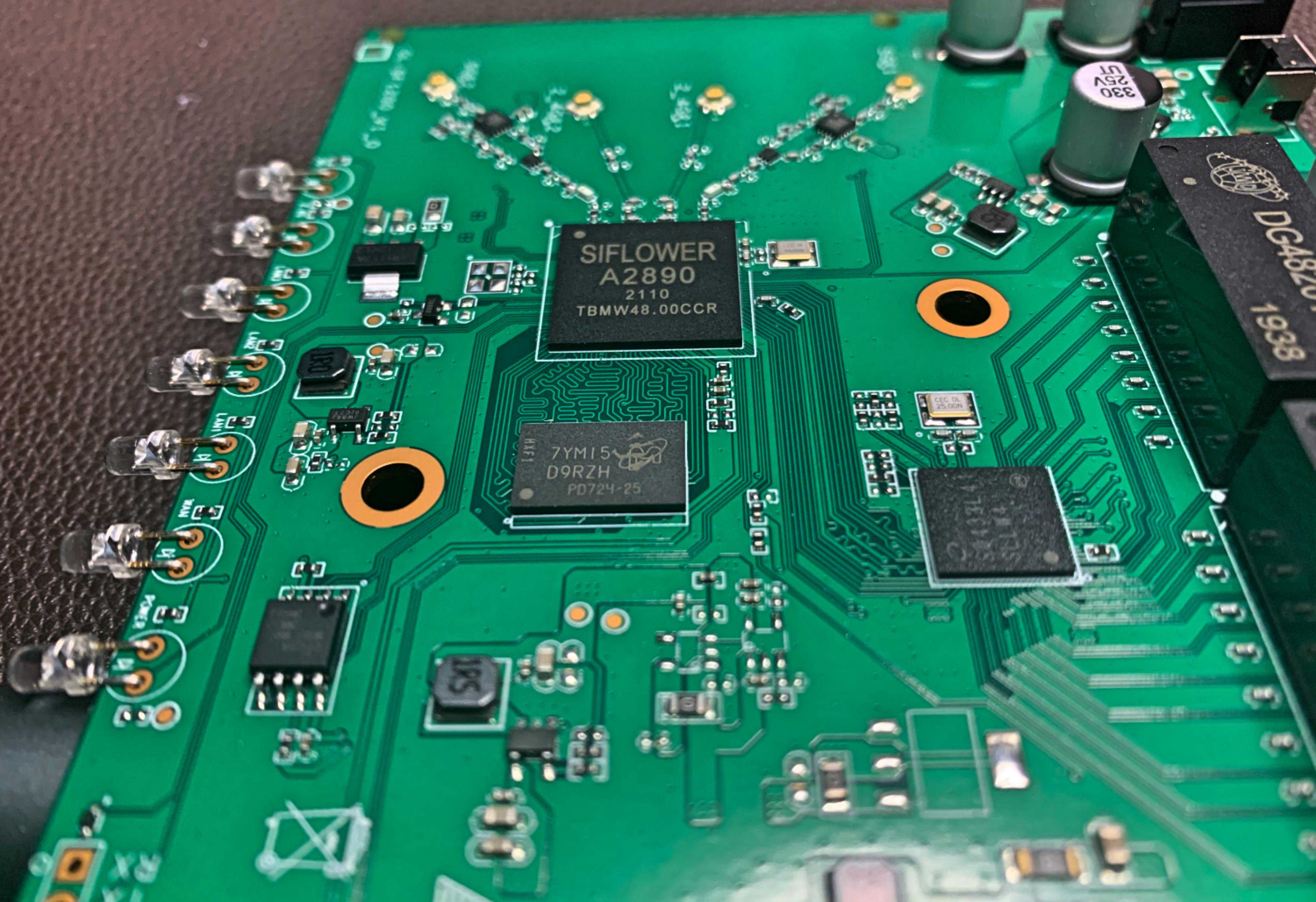 稍微看看芯片吧,最顶上标A2890的就是矽昌SF19A2890了,正下方是镁光128M内存,右下方应该是一颗交换机芯片。