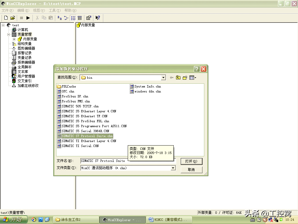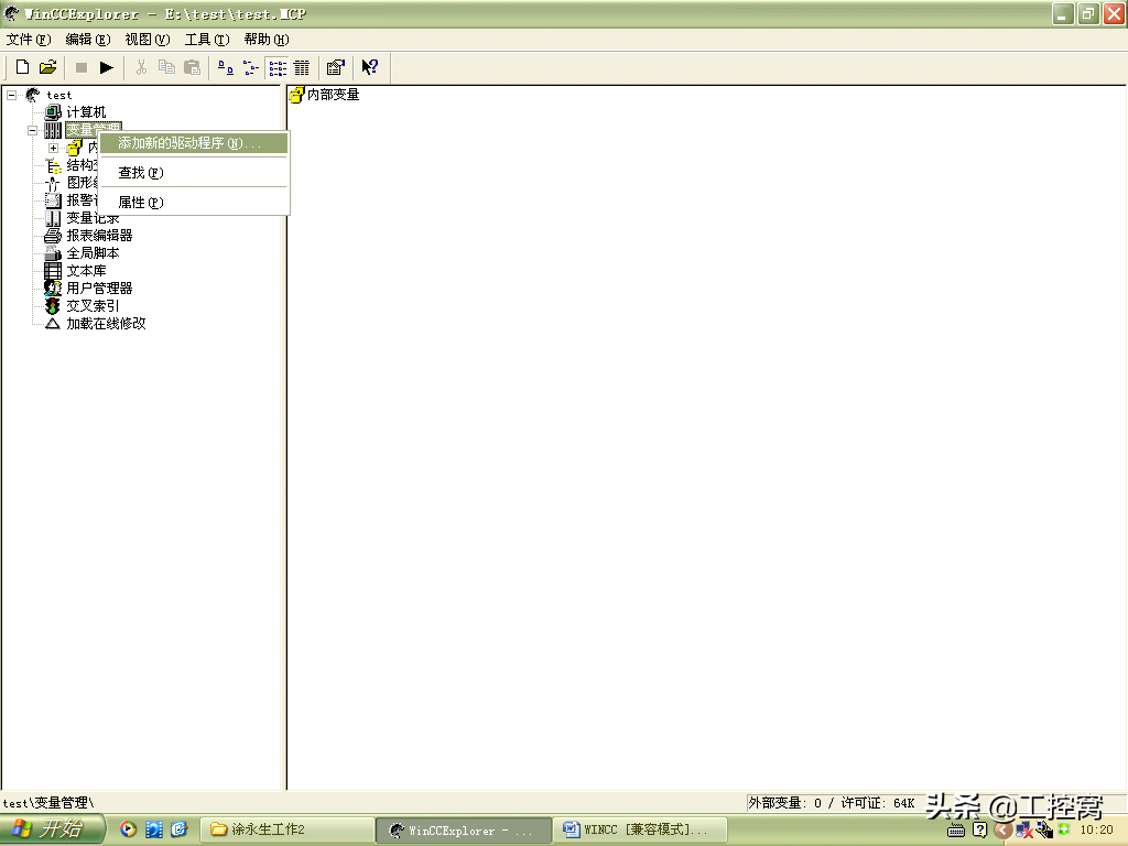 5.添加新的驱动程序和设置系统参数,打开新创建的工程"test",在项目管理栏里选择"变量管理",单击右键选择"添加新的驱动程序",如图5所示。