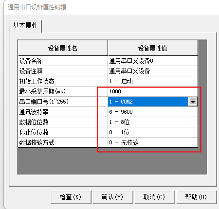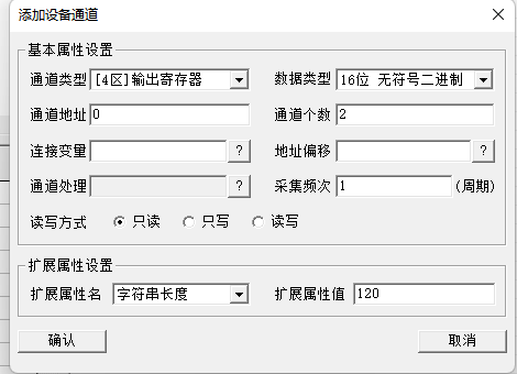 子设备参数配置,这里选择的是ModbusRTU_串口,设备属性保持默认即可,主要是添加通道,关键配置点如图所示:4区输出寄存器,16位无符号二进制,通道地址0,个数2,只读。