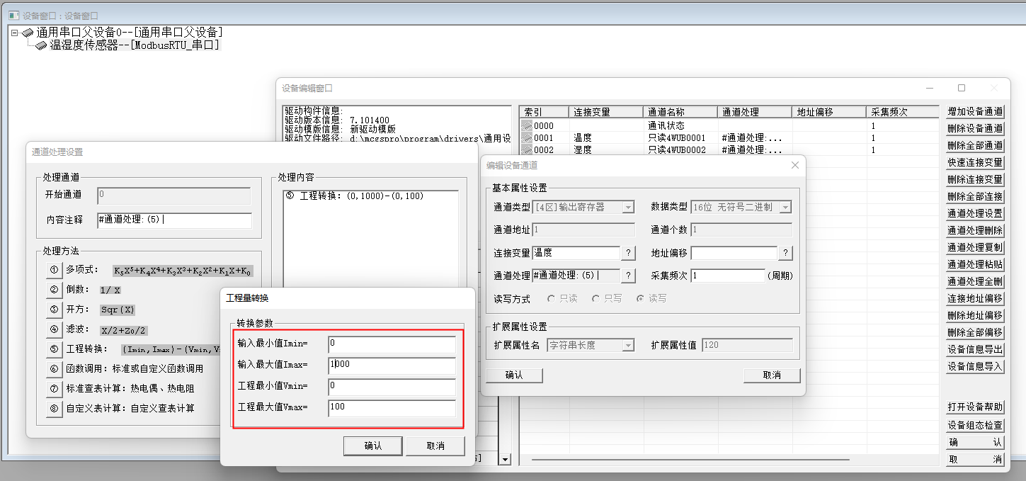 通道处理,因为实际数据是采集数据的1/10,所以需要进行通道处理,在设备窗口。